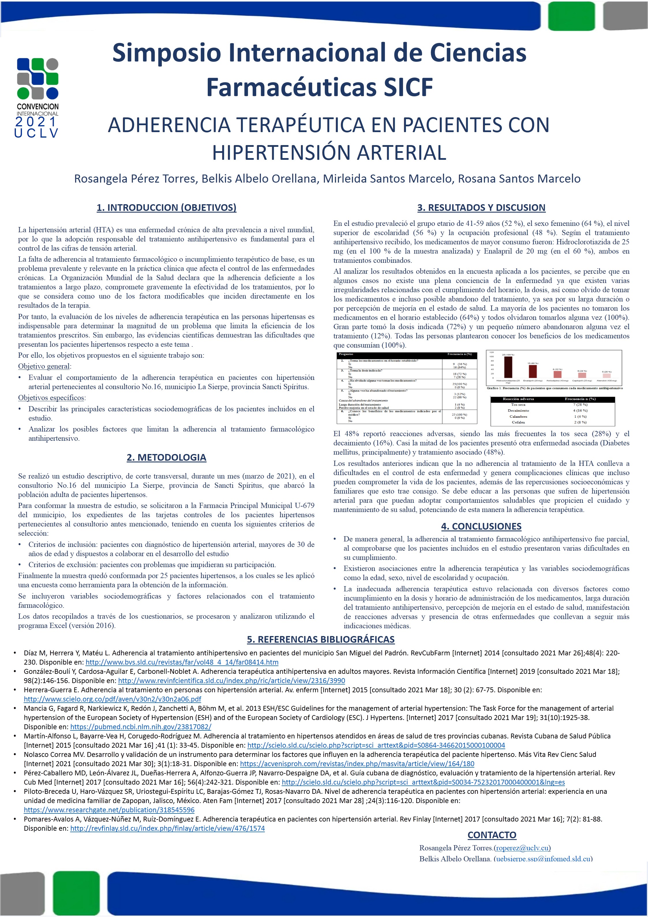 Introducción: La hipertensión arterial (HTA) es una enfermedad crónica de alta prevalencia a nivel mundial, por tanto, la adopción responsable del tratamiento antihipertensivo es fundamental para el control adecuado de las cifras de tensión arterial. Objetivo: Evaluar el comportamiento de la adherencia terapéutica en pacientes hipertensos. Materiales y métodos: Se realizó un estudio descriptivo, transversal en 25 pacientes del consultorio 16 de La Sierpe, Sancti Spíritus, en marzo 2021. Se estudiaron variables sociodemográficas y factores relacionados con el tratamiento farmacológico de la HTA. Se utilizó la encuesta como instrumento de recogida de información. El análisis de los datos obtenidos se realizó en Excel. Resultados: Predominó el grupo etario de 41-59 años (52%), los sujetos del sexo femenino (64%), mayor nivel de escolaridad (56%) y los profesionales (48%). Los medicamentos de mayor consumo fueron Hidroclorotiazida 25 mg (100%) y Enalapril 20 mg (60%). La mayoría de los pacientes no tomaron los medicamentos en el horario establecido (64%) y todos olvidaron tomarlos alguna vez (100%). Gran parte tomó la dosis indicada (72%) y un pequeño número abandonaron alguna vez el tratamiento (12%). Todas las personas plantearon conocer los beneficios de los medicamentos que consumían (100%). El 48% reportó reacciones adversas, siendo las más frecuentes la tos seca (28%) y el decaimiento (16%). Casi la mitad de los pacientes presentó otra enfermedad y tratamiento asociado (48%). Conclusiones: La adherencia al tratamiento antihipertensivo fue parcial al presentarse varias dificultades en su cumplimiento, lo cual estuvo relacionado con diversos factores.