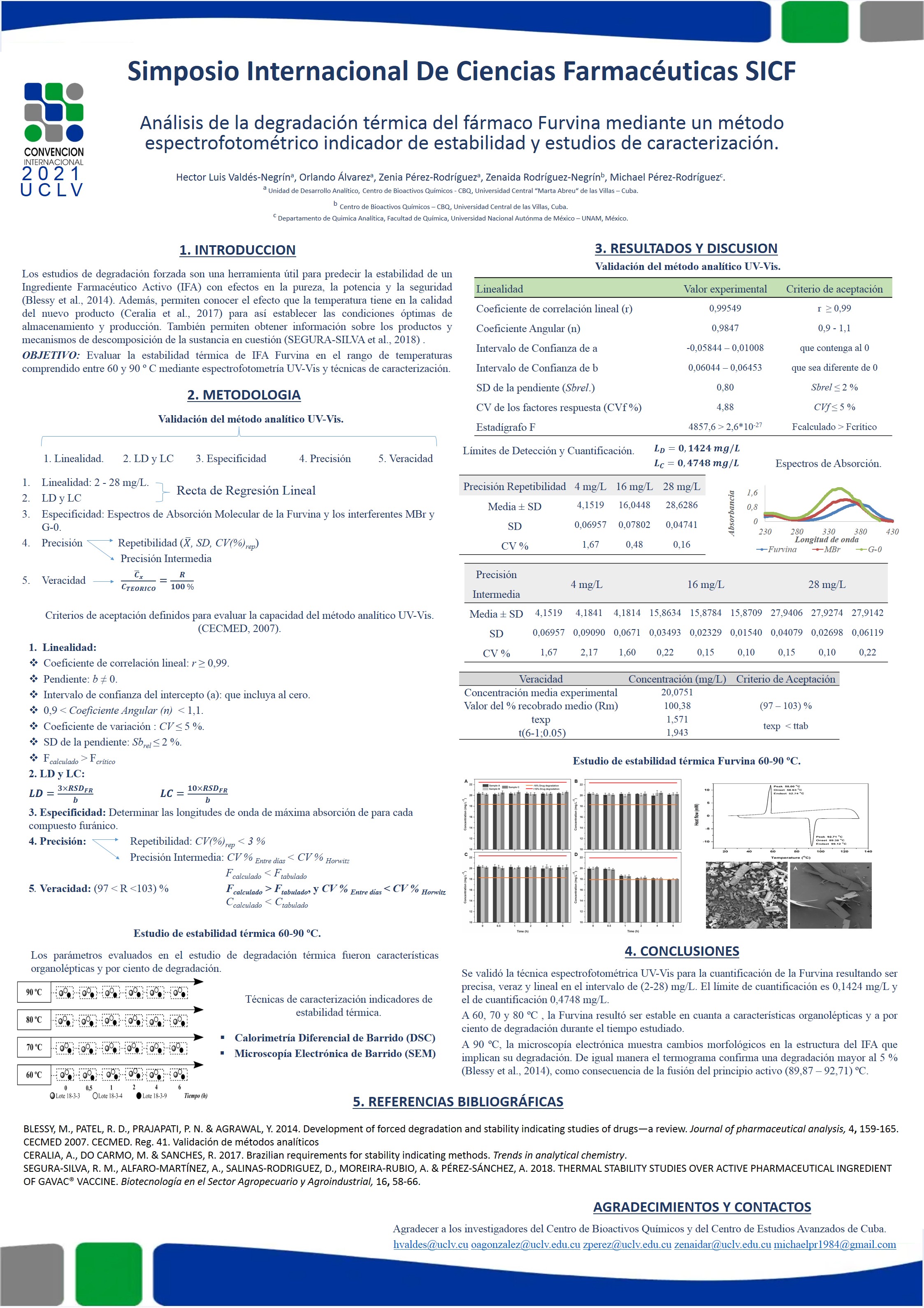 La estabilidad de las moléculas farmacéuticas está estrechamente relacionada con la seguridad y la eficacia del producto farmacéutico. En este trabajo se investigó la estabilidad térmica y la cinética de degradación de la furvina mediante un método espectrofotométrico fiable. Para alcanzar este objetivo, se sometieron tres muestras aleatorias de furvina a condiciones de estrés térmico variando la temperatura de 60 a 90 °C con un aumento gradual de 10 °C en función del tiempo. El método propuesto mostró límites de detección (LOD) y cuantificación (LOQ) de 0,14 y 0,47 μg mL-1, respectivamente. Al enriquecer las muestras de furvina tratadas térmicamente se obtuvieron precisiones inferiores al 6,0% y exactitudes en el rango del 97,8-102,5%. El efecto de la temperatura influye en la estabilidad de la furvina mostrando una tendencia a disminuir gradualmente su rendimiento al aumentar el tiempo de exposición, lo que fue confirmado por DSC, FT-IR y análisis SEM. Este fármaco se degradó en torno al 10% cuando se expuso a 90 °C durante 6 h, cumpliendo con los límites de degradación razonables establecidos por el CECMED y la normativa ICH. El comportamiento de degradación de la furvina siguió una cinética de primer orden asociada a un coeficiente de correlación de 0,9924. Los hallazgos encontrados aquí permitirán entender la estabilidad térmica de la furvina, con el objetivo de proponer potenciales aplicaciones en la industria farmacéutica.