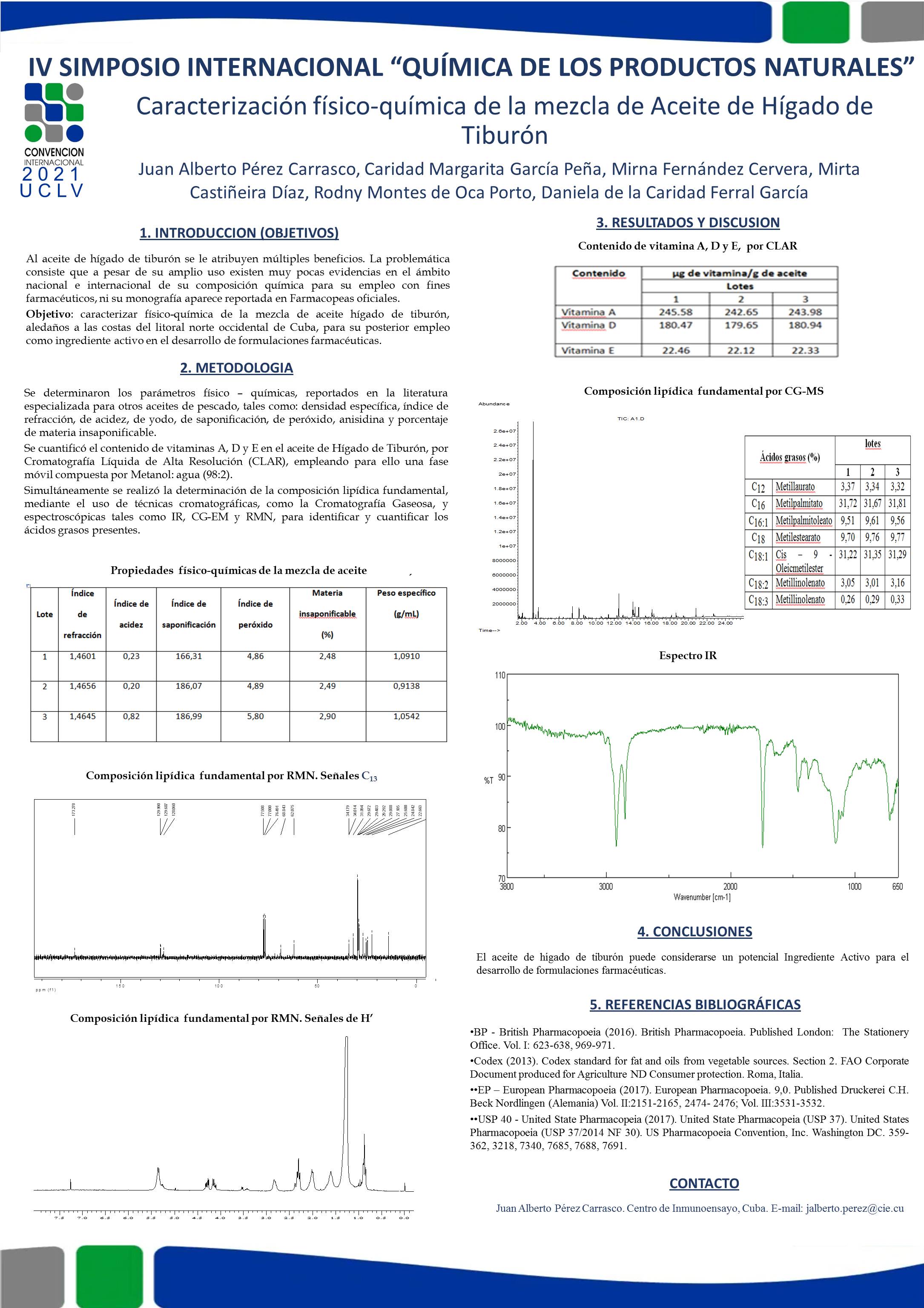 Al aceite de hígado de tiburón se le atribuyen múltiples beneficios. La problemática consiste que a pesar de su amplio uso existen muy pocas evidencias en el ámbito nacional e internacional de su composición química para su empleo con fines farmacéuticos, ni su monografía aparece reportada en Farmacopeas oficiales. Objetivo: caracterizar físico-química de la mezcla de aceite hígado de tiburón, aledaños a las costas del litoral norte occidental de Cuba, para su posterior empleo como ingrediente activo en el desarrollo de formulaciones farmacéuticas. Metodología: se determinaron los parámetros físico – químicas, reportados en la literatura especializada para otros aceites de pescado, tales como: densidad específica, índice de refracción, de acidez, de yodo, de saponificación, de peróxido, anisidina y porcentaje de materia insaponificable. Se cuantifica el contenido de vitaminas A, D y E en el aceite de Hígado de Tiburón, por Cromatografía Líquida de Alta Resolución (CLAR), empleando para ello una fase móvil compuesta por Metanol: agua (98:2). Simultáneamente se realiza la determinación de la composición lipídica fundamental, mediante el uso de técnicas cromatográficas, como la Cromatografía Gaseosa, y espectroscópicas tales como IR, CG-EM y RMN, para identificar y cuantificar los ácidos grasos presentes. Resultados y discusión: Los resultados obtenidos demuestran que la mezcla de aceite puede considerarse un potencial ingrediente activo farmacéutico porque presenta un alto contenido de vitamina A y de ácido palmítico, seguido de esteárico, oleico y linoleico. Conclusiones: El aceite de hígado de tiburón puede considerarse un potencial Ingrediente Activo para el desarrollo de formulaciones farmacéuticas.
