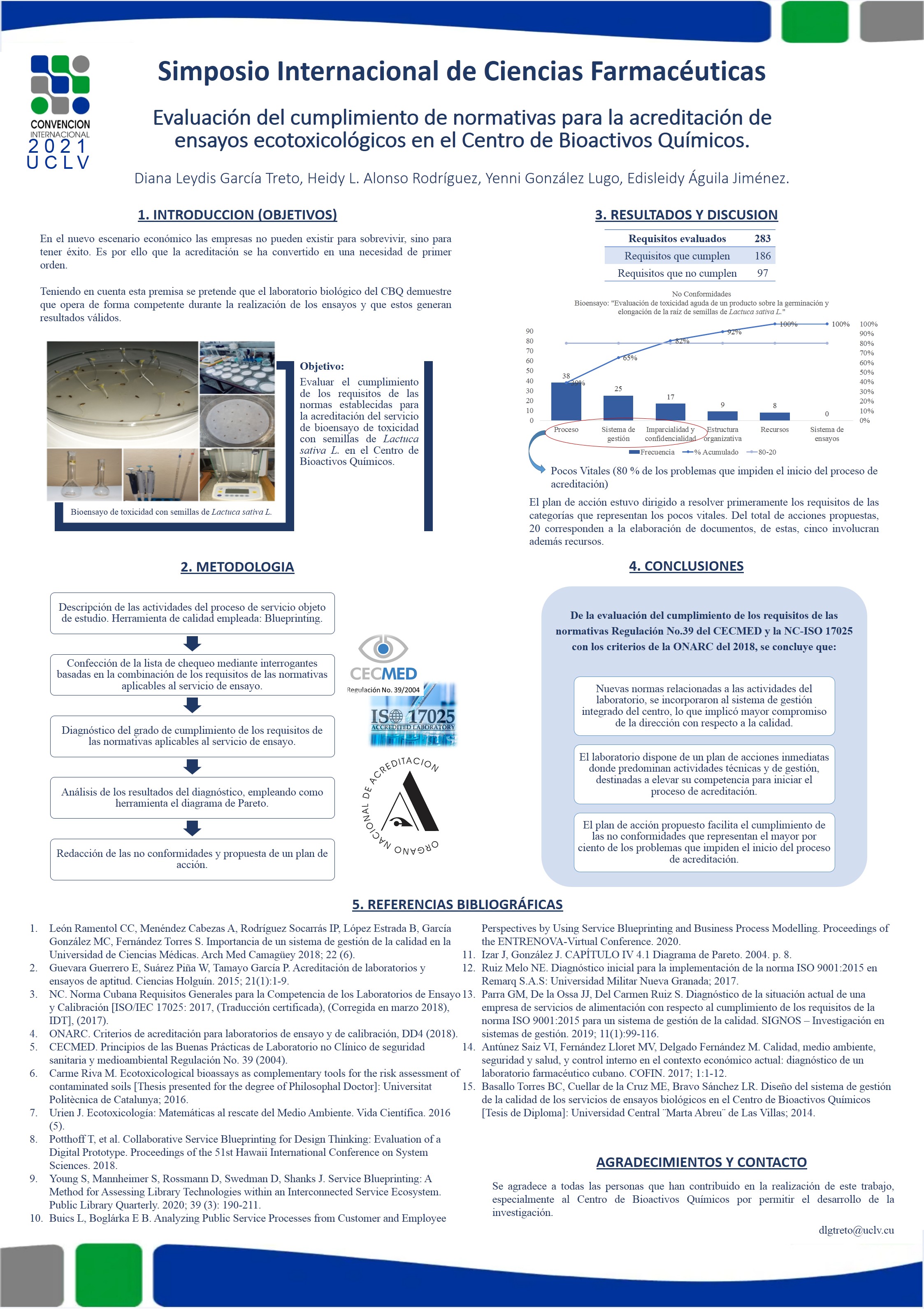 En el nuevo escenario económico las empresas no pueden existir para sobrevivir, sino para tener éxito. Es por ello que la acreditación se ha convertido en una necesidad de primer orden. Teniendo en cuenta esta premisa, se pretende que el laboratorio biológico del Centro de Bioactivos Químicos (CBQ), bajo el alcance de un sistema de gestión integrado, demuestre que opera de forma competente y genera resultados válidos. Esta investigación tiene como objetivo evaluar el cumplimiento de las normas establecidas para la acreditación del servicio de bioensayo de toxicidad con semillas de Lactuca sativa L. en el CBQ. El diagnóstico del grado de cumplimiento de los requisitos de las regulatorias aplicables al servicio de bioensayo, estuvo concebido desde el análisis de cada una de las etapas del proceso de servicio hasta la identificación y procesamiento de los problemas que impide la acreditación del servicio de ensayo; para ello se utilizaron herramientas como: el blueprinting, la lista de chequeo y el diagrama de Pareto. De un total de 286 requisitos evaluados se incumplieron 97 (34 %), los cuales se relacionaron fundamentalmente con requisitos relativos a: proceso del servicio de ensayo, elementos del sistema de gestión, imparcialidad y confidencialidad. Además, se confeccionó un plan de acción para darle solución a los requisitos incumplidos que representan el mayor porcentaje de los problemas que impiden el inicio del proceso de acreditación.
