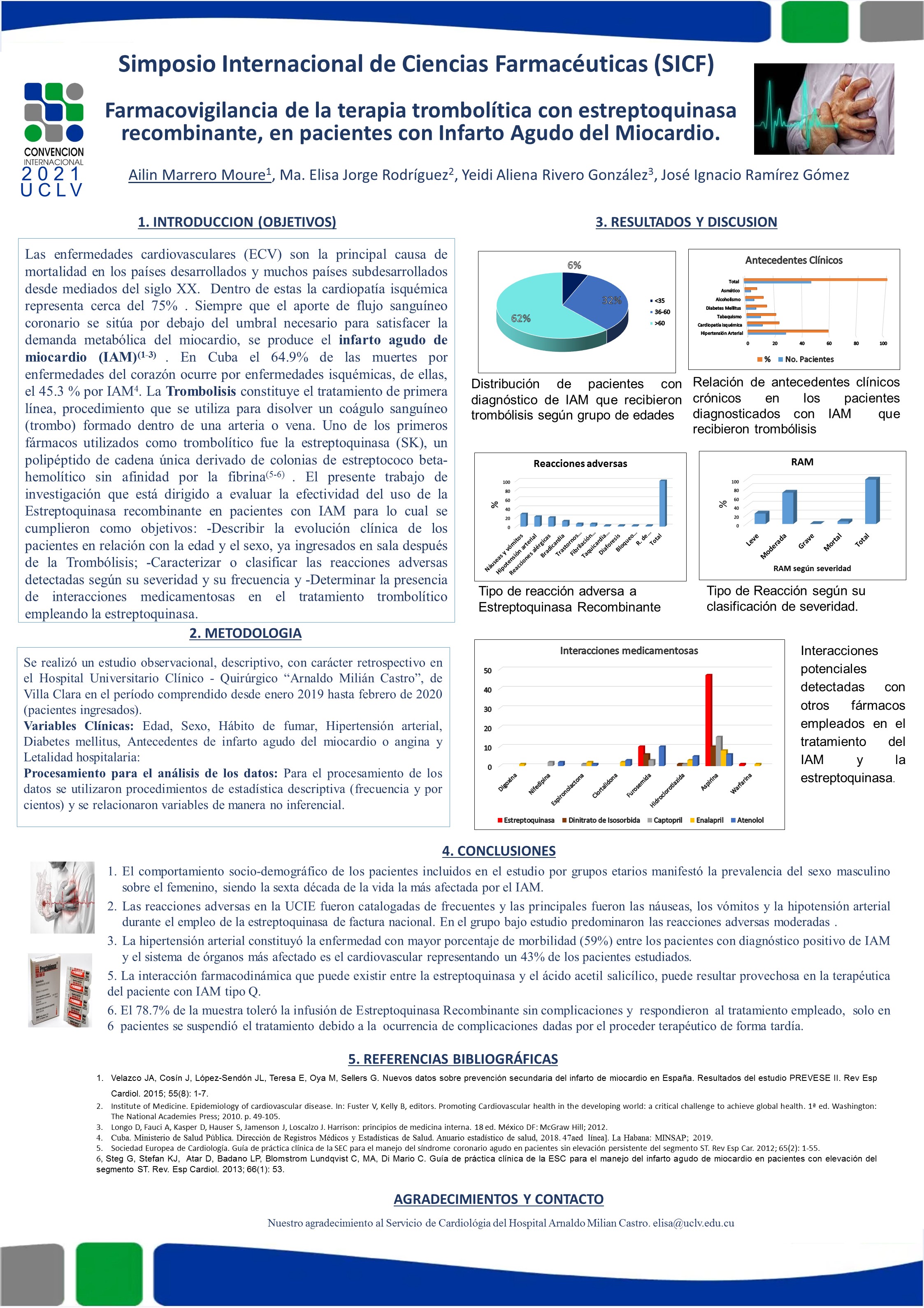 El infarto agudo de miocardio es indudablemente una afección frecuente que se acompaña de alta mortalidad y está considerada como la principal causa de muerte en los países con alto desarrollo económico. El presente trabajo estuvo centrado en el tratamiento con Estreptoquinasa Recombinante (SK) a pacientes aquejados de esta patología en el hospital “Arnaldo Milián Castro”, de la provincia de Villa Clara, en el período de enero del 2019 a febrero del 2020. El universo abarcó 180 pacientes y la muestra se conformó con 47 pacientes diagnosticados a los que se les aplicó el medicamento. Como resultado el sexo masculino presentó los mayores niveles de morbilidad y mortalidad, siendo la sexta década de la vida la más afectada por esta patología; la hipertensión arterial constituyó la enfermedad con mayor porcentaje de morbilidad (59%). Más de la mitad del total de pacientes trombolizados presentaron al menos una sospecha de reacción adversa a medicamentos donde las náuseas, los vómitos y la hipotensión severa fueron las reacciones adversas de mayor incidencia en el tratamiento. Prevalecieron las reacciones moderadas en el 70% y las frecuentes en el 66.6%. El sistema más afectado fue el cardiovascular con un 43%. De los 47 pacientes trombolizados el 85% egresaron vivos y el 14.8% fallece. El 78.7% de los casos no presentó complicaciones clínicas ni electrocardiográficas y la cantidad de pacientes que evolucionaron de manera positiva fue estadísticamente superior a los que fallecieron. Solo hubo interacciones entre el medicamento con la warfarina, la furosemida y el ácido acetil salicílico.