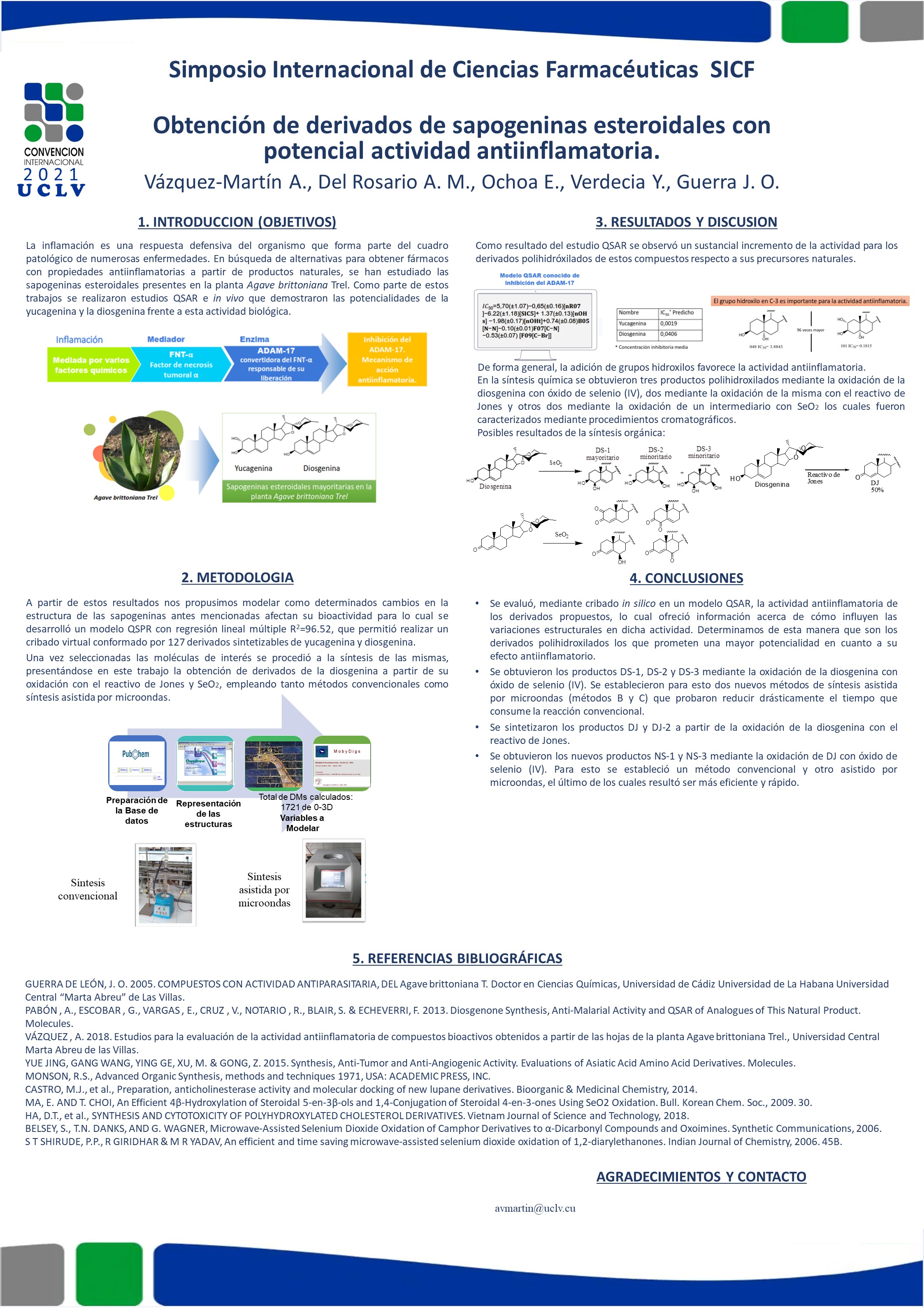 La inflamación es una respuesta defensiva del organismo que forma parte del cuadro patológico de numerosas enfermedades. En búsqueda de alternativas para obtener fármacos con propiedades antiinflamatorias a partir de productos naturales, se han estudiado las sapogeninas esteroidales presentes en la planta Agave brittoniana Trel. Como parte de estos trabajos se realizaron estudios QSAR e in vivo que demostraron las potencialidades de la yucagenina y la diosgenina frente a esta actividad biológica.