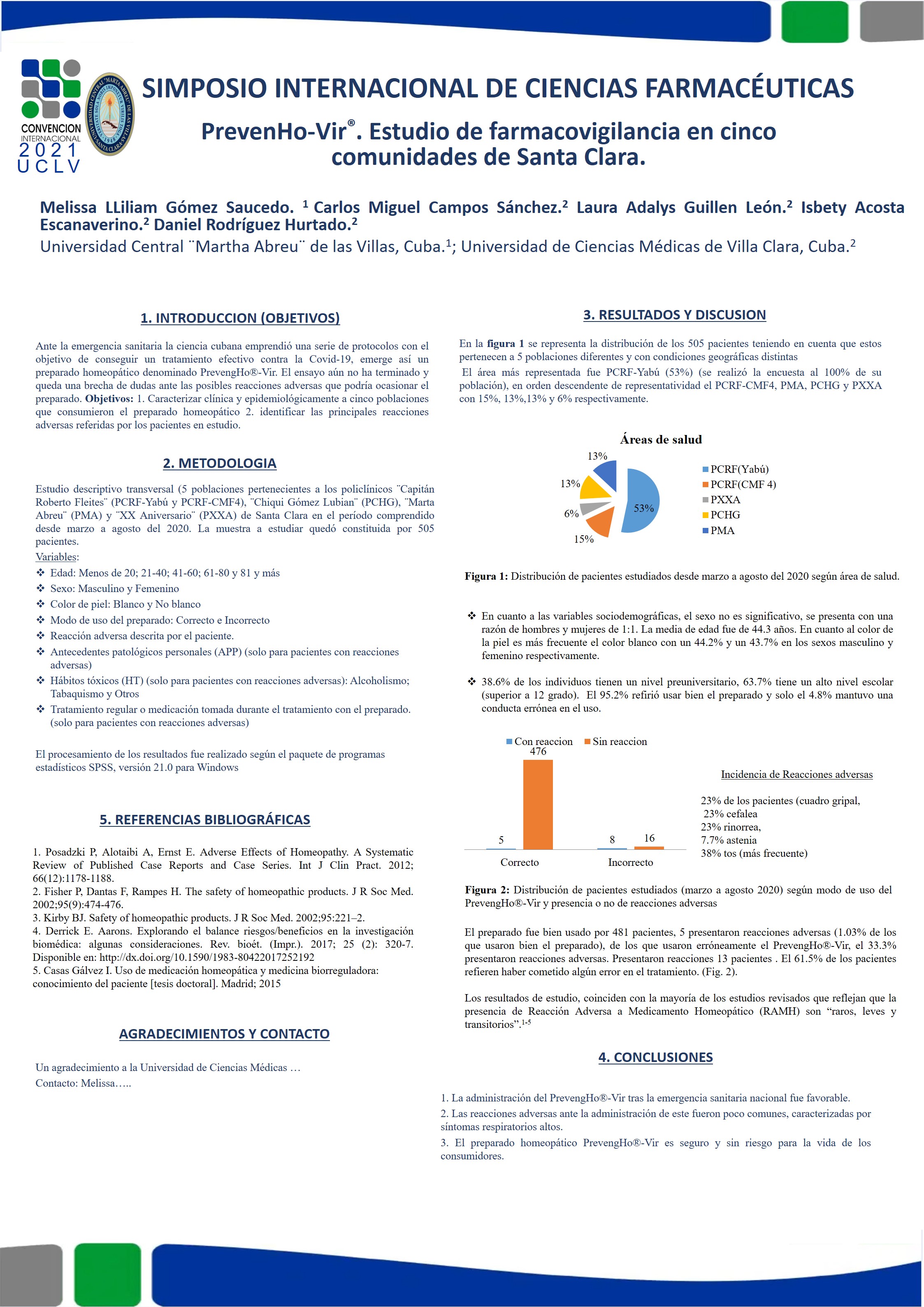 Ante la emergencia sanitaria la ciencia cubana emprendió una serie de protocolos con el objetivo de conseguir un tratamiento efectivo contra la Covid-19, emerge así un preparado homeopático denominado PrevengHo®-Vir. El ensayo deja una brecha de dudas ante las posibles reacciones adversas que podría ocasionar el preparado. Objetivo: Caracterizar clínica y epidemiológicamente a cinco poblaciones que consumieron el preparado homeopático e identificar las principales reacciones adversas referidas por los pacientes en estudio. Metodología: Se realizó un estudio descriptivo transversal en cinco poblaciones del municipio de Santa Clara, utilizando una muestra N= 505. Resultados: se presenta una razón de hombres y mujeres de 1:1, con una media de 44.3 años, el 63.7% tiene un alto nivel escolar (superior a 12 grado), solo el 4.8% mantuvo una conducta errónea en el uso de estos de los cuales el 3.2% presentaron un bajo nivel educacional. Presentaron reacciones un total de 13 pacientes, 53.8% del sexo femenino, el 92.3% de piel blanca, no se evidenciaron reacciones adversas en mayores de 80 años, el 38% de los pacientes refieren haber presentado tos, el 23% un cuadro gripal, otro 23% cefalea, 23% rinorrea, un 7.7% astenia para una tasa de incidencia de 2.57 x 100 pacientes. Conclusiones: Las reacciones adversas en su mayoría son leves y no necesitan de atención médica urgente. El preparado homeopático PrevengHo®-Vir es seguro y sin riesgo para la vida de los consumidores.