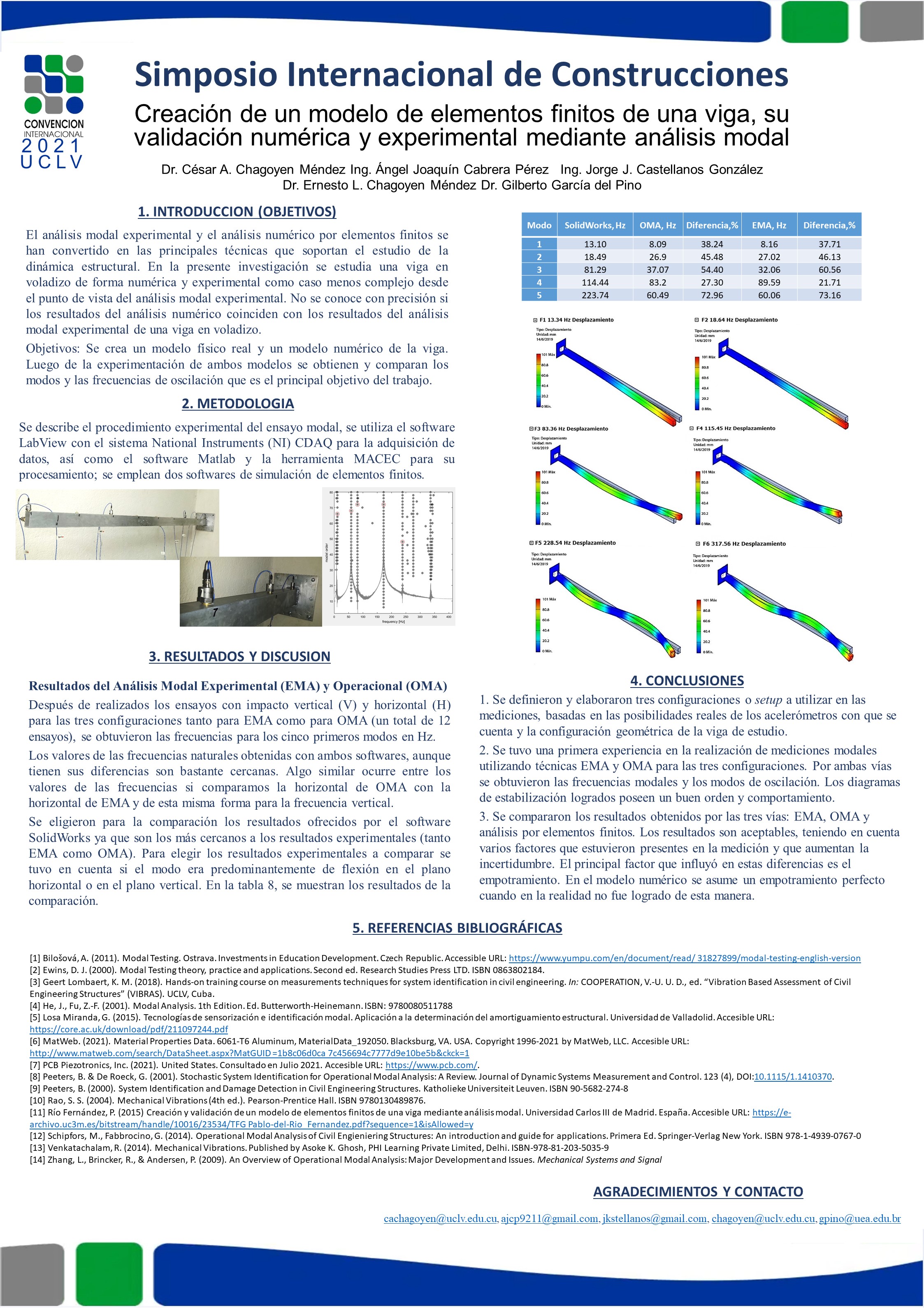 • Resultados y discusión: Se obtuvieron y compararon las principales características dinámicas de forma experimental y numérica, es decir, las frecuencias modales y los modos de oscilación.