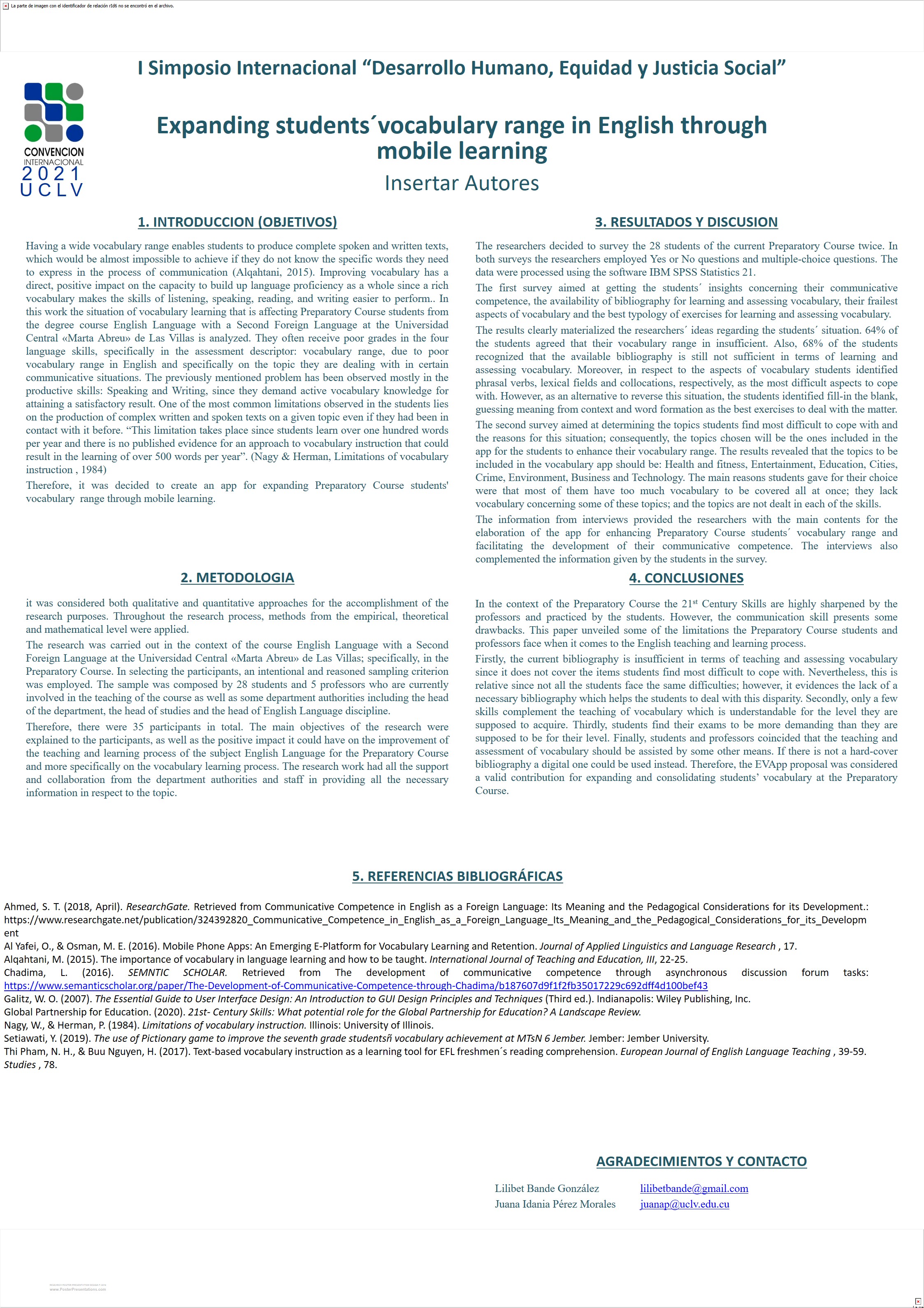 El idioma inglés se ha expandido por el mundo impregnando todos los niveles sociales. Su presencia en las esferas intelectuales y científicas resalta la importancia de su aprendizaje. Sin embargo, en la Universidad Central «Marta Abreu» de Las Villas los estudiantes del Curso Preparatorio enfrentan limitaciones con respecto al vocabulario, lo que se refleja en algunas fallas durante la comunicación en inglés. El objetivo de esta investigación es proponer la creación de una aplicación para ampliar la gama de vocabulario de estos estudiantes y fomentar su fluidez al comunicarse en inglés. Se emplearon métodos del nivel teórico, empírico y matemático; los que demostraron la pobre sistematización del vocabulario en algunos temas y la falta de bibliografía para aprender y evaluar vocabulario. Por tanto, se decidió crear a EVApp, (English Vocabulary App), una aplicación de vocabulario en inglés para solucionar esa disparidad y que fue reconocida por profesores y estudiantes como una contribución válida para la carrera.