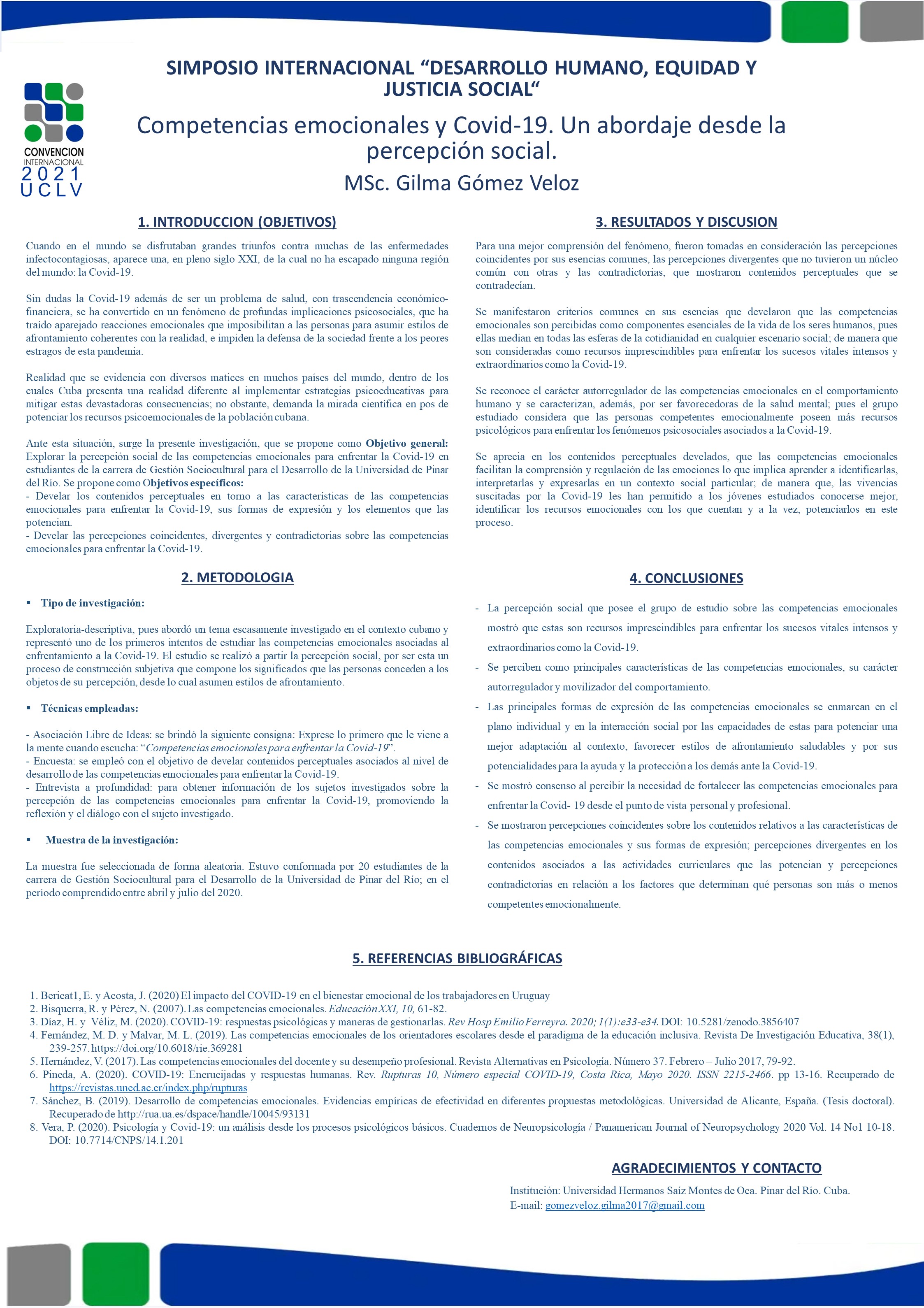carrera de Gestión Sociocultural para el Desarrollo de la Universidad de Pinar del Río. Se realizó una investigación exploratoria-descriptiva desde un diseño cualitativo, con el empleo de métodos teóricos como el fenomenológico, el histórico- lógico y el sistémico-estructural; además de métodos empíricos como la asociación libre de ideas, la encuesta y la entrevista a profundidad. La muestra estuvo compuesta por 20 estudiantes, seleccionados de forma aleatoria. Fueron tomadas en consideración las percepciones coincidentes, las percepciones divergentes y las contradictorias; mostrándose en los resultados un predominio de las percepciones consensuadas o coincidentes sobre el valor de las competencias emocionales en el contexto pandémico desde la dimensión personal y profesional. Se develan percepciones divergentes en torno al desarrollo de las competencias emocionales en la formación profesional, aunque resalta la necesidad de potenciarlas; a fin de ser formados como profesionales capaces de ofrecer a los grupos y comunidades la ayuda pertinente para enfrentar las situaciones de crisis. Premisas desde las cuales se reconoce que las competencias emocionales son imprescindibles para el enfrentamiento de situaciones de emergencia como la Covid-19.