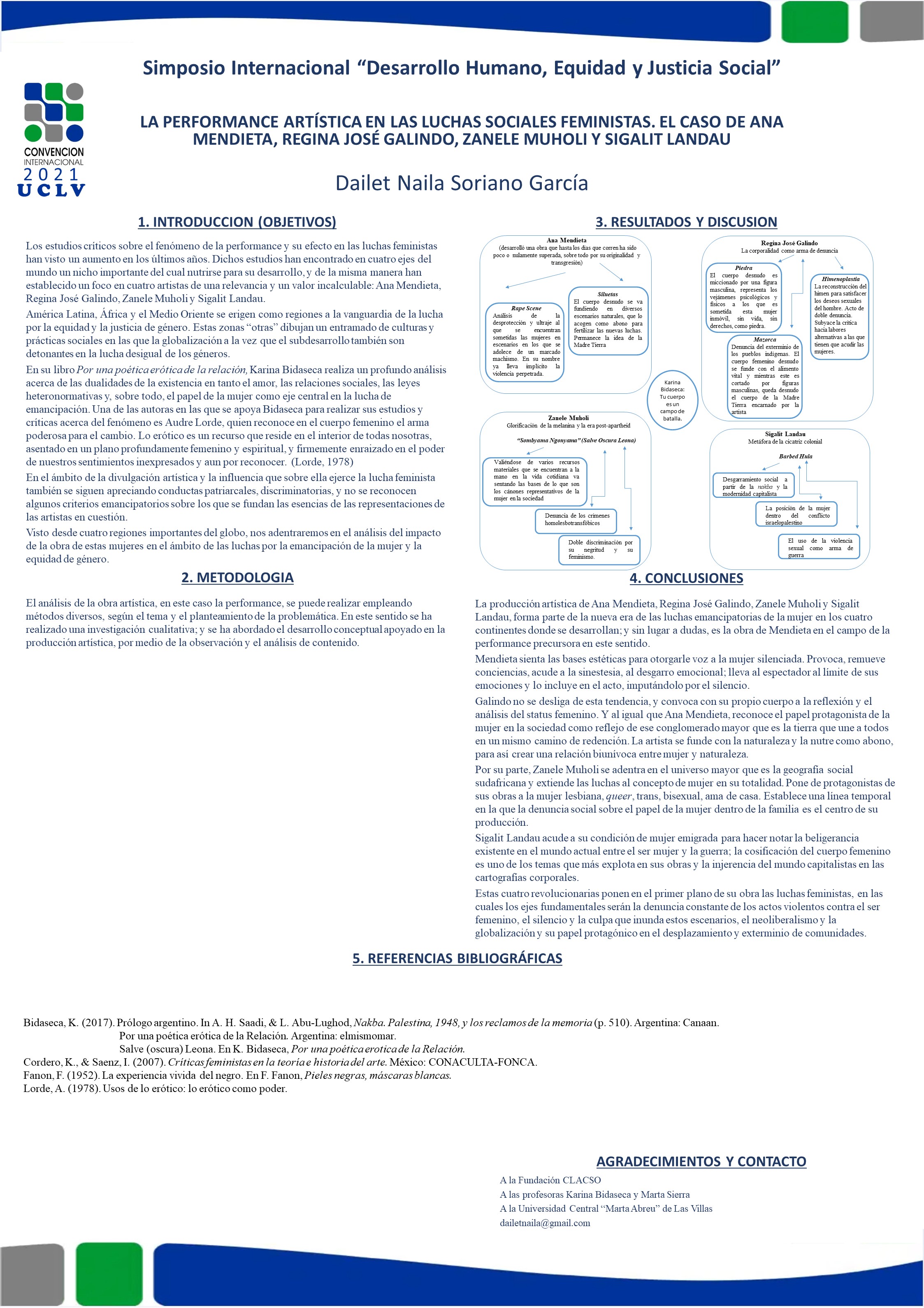This research focuses on the critical appraisal of her works and the validity of their permanence in the artistic field used by current feminist movements around the world. The catalog of photographs of the representations that appear on the website of each artist was taken as a sample, and a thematic decantation was made. The exploration of the works of these artists allows us to demonstrate the social impact that performance has in denouncing abuse.