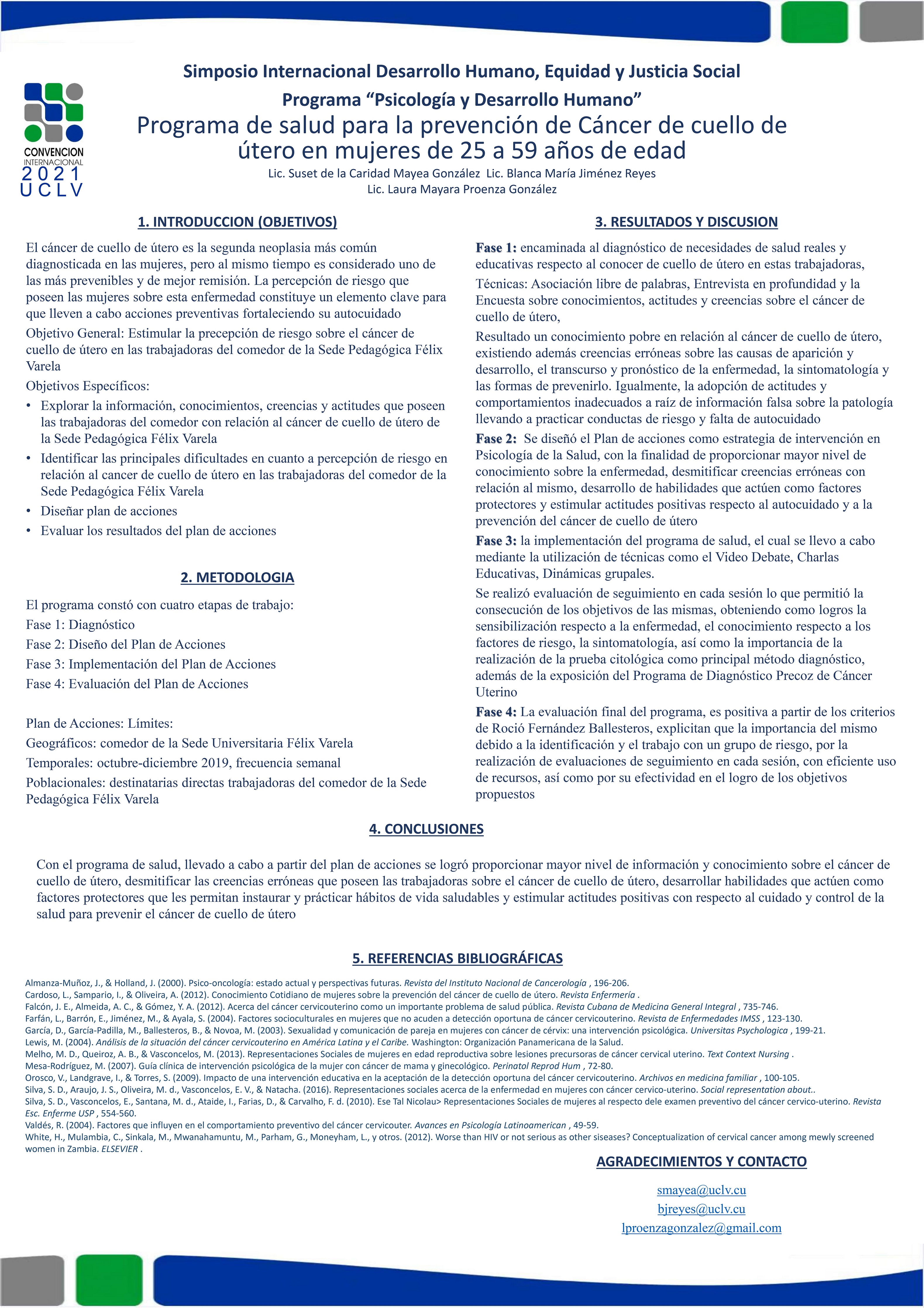 Cervical cancer is the second most common malignancy diagnosed in women, but at the same time it is considered one of the most preventable and with the best remission. The perception of risk that women have about this disease is a key element for them to carry out preventive actions strengthening their self-care, hence the aim of this work is to: stimulate the perception of risk of cervical cancer in the workers of the canteen of the Pedagogical Headquarters Félix Varela, based on a Health Program. For this, 4 stages of work were developed. The first of these, aimed at diagnosing real and educational health needs regarding the knowledge of the cervix in these workers, was carried out using three fundamental techniques: free association of words, in-depth interview and the survey on knowledge , attitudes and beliefs about cervical cancer, which resulted in Poor knowledge regarding cervical cancer, and there are also erroneous beliefs about the causes of its onset and development, the course and prognosis of the disease, the symptoms and ways to prevent it. Likewise, the adoption of inappropriate attitudes and behaviors as a result of false information about the pathology leading to the practice of risky behaviors and lack of self-care. In the second stage, the Action Plan was designed as an intervention strategy in Health Psychology, in order to provide a higher level of knowledge about the disease, demystify erroneous beliefs in relation to it, development of skills that act as protective factors, and stimulate positive attitudes regarding self-care and prevention of cervical cancer. The third stage was the implementation of the health program, which was carried out using techniques such as the Video Debate, Educational Talks, Group Dynamics , and a follow-up evaluation was carried out in each session, which allowed the achievement of the their objectives, obtaining as achievements awareness regarding the disease, knowledge regarding risk factors, symptoms, as well as the importance of performing the cytological test as the main diagnostic method, in addition to exposing the Early Diagnosis of Uterine Cancer. The final evaluation of the program is positive based on the criteria of Rocio Fernández Ballesteros, they explain that its importance due to the identification and work with a risk group, by carrying out follow-up evaluations in each session, with efficient use of resources, as well as for their effectiveness in achieving the proposed objectives.