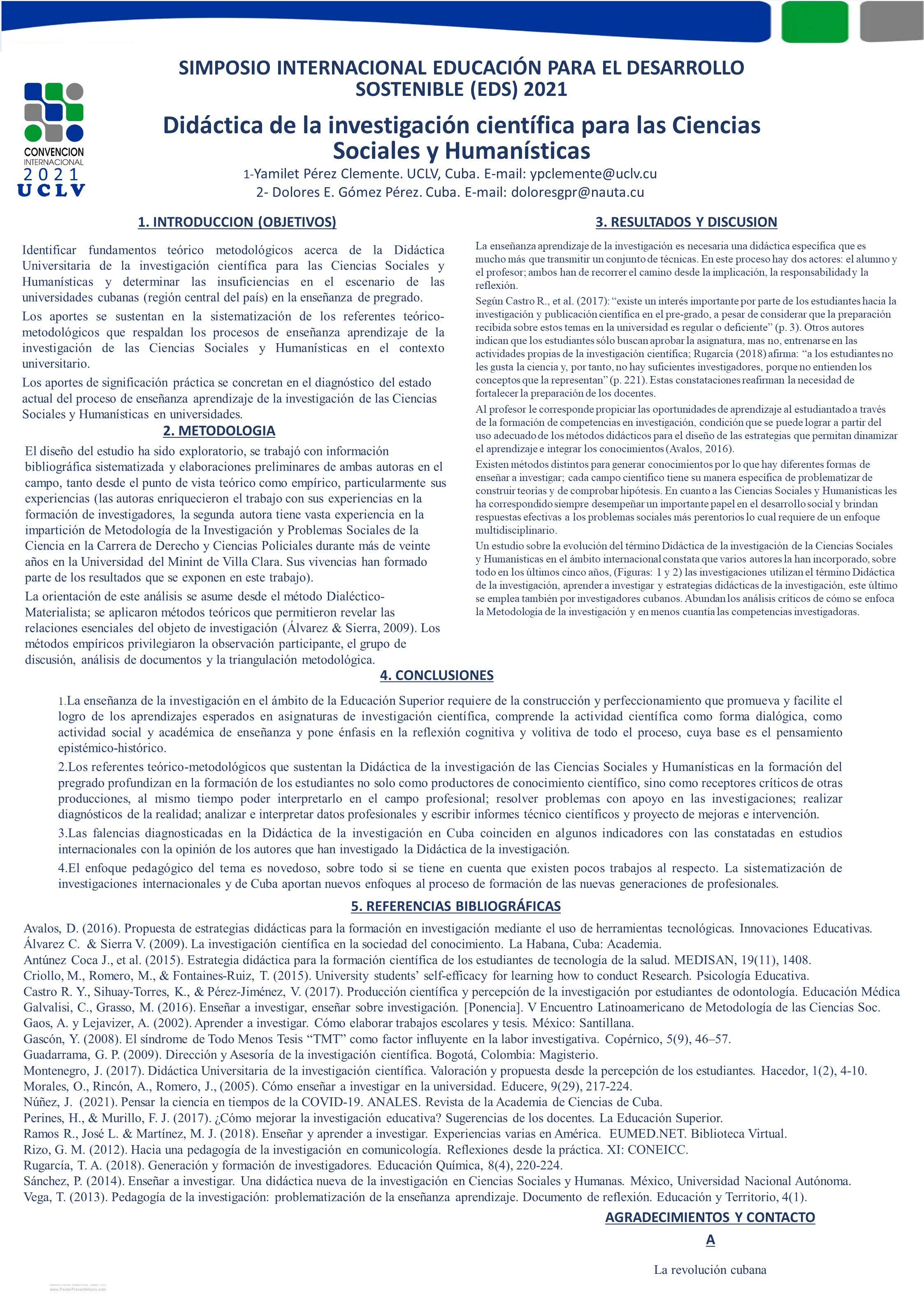 El proceso de enseñanza aprendizaje de la investigación científica en las Ciencias Sociales y Humanísticas ha sido tratado por varios autores desde fecha tan temprana como 1995. Se destacan, los autores, Montenegro, Ramos, Sánchez Puentes, Gallegos y Rizo; que utilizan los términos: didáctica de la investigación científica, formación de investigadores, estrategias didácticas para la investigación, y otros. La presente ponencia recoge resultados de un estudio exploratorio que tiene como objetivo identificar fundamentos teóricos metodológicos acerca de la Didáctica Universitaria de la investigación científica para las Ciencias Sociales y Humanísticas y determinar las insuficiencias en el escenario de las universidades cubanas (región central del país) en la enseñanza de pregrado.La metodología empleada privilegió el análisis documental, la observación y la triangulación metodológica; se profundizó en la obtención de los datos teniendo en cuenta la experiencia de las autoras en la enseñanza de la metodología de la investigación científica e investigaciones realizadas. El enfoque pedagógico del tema es novedoso, sobre todo si se tiene en cuenta que existen pocos trabajos al respecto. La sistematización de investigaciones internacionales y de Cuba aportan nuevos enfoques al proceso de formación de las nuevas generaciones de profesionales. Se concluyó que la enseñanza de la investigación en el ámbito de la Educación Superior requiere de la construcción y perfeccionamiento de una nueva didáctica, reflexión a la que este trabajo contribuye.Es inconcebible la formación profesional universitaria sin el aprendizaje de la investigación científica;