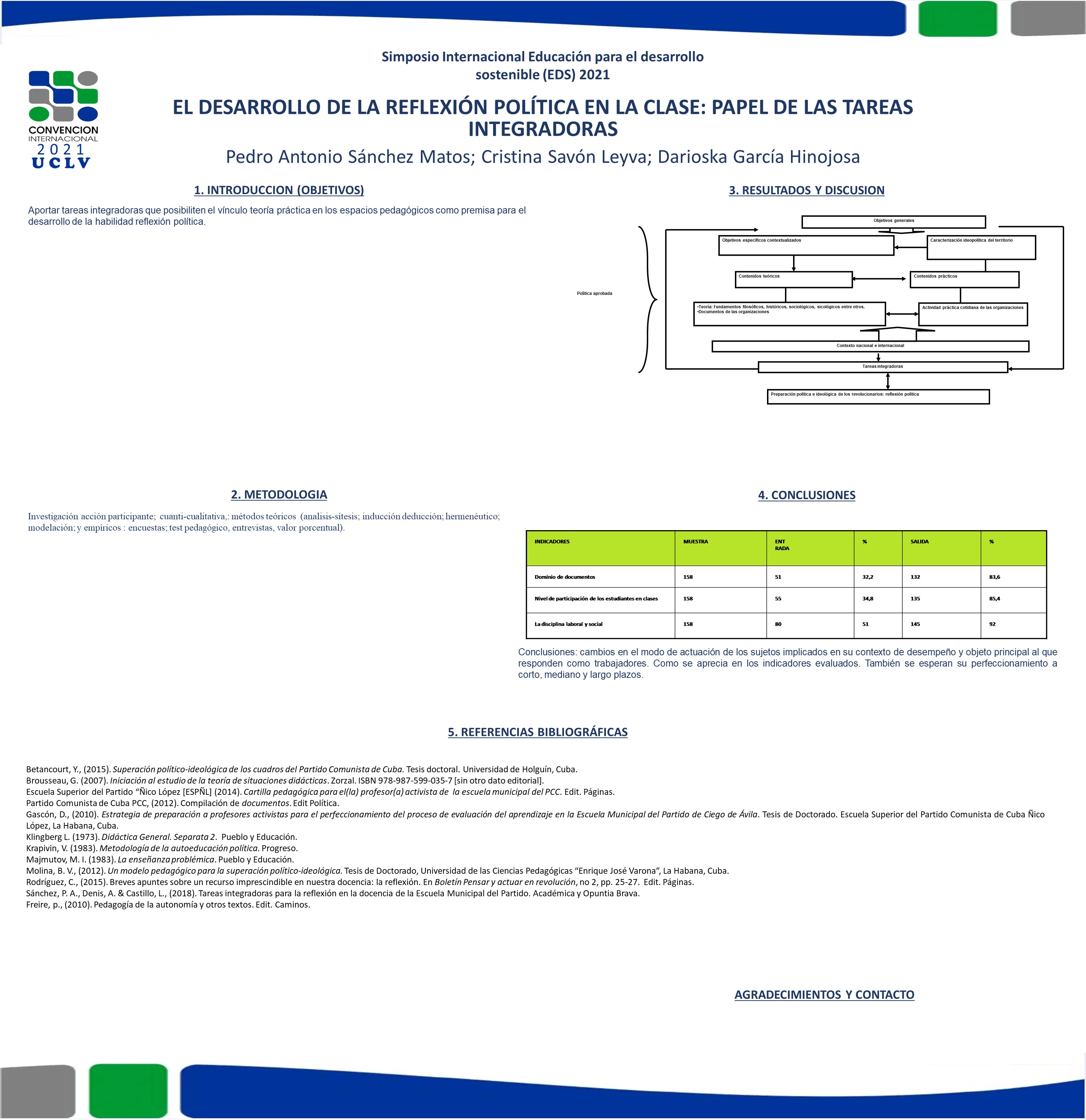 In this work the authors address the problem of political reflection as a basic ability to form in a revolutionary pedagogy. It is intended to provide integrative tasks that enable the practical theory link in pedagogical spaces. For this, the theoretical methods were used: analysis and synthesis, induction and deduction, and modelation; the empirical ones: interviews, pedagogical test, observation and survey; in teaching: problems. As a contribution, the researchers allowed to analyze the aforementioned matter from some theoretical foundations, its praxis and the obtaining of the proposal in question. Meanwhile, the employees in the teaching practice ―problemic methods― allowed in the first place, the construction of the tasks from the praxis and secondly to demonstrate the effectiveness of the proposal. Therefore they facilitated raising the quality of the development of this skill. The work is configured as a result of the experiences applied in the 2013-2014 to 2019-2020 academic years, first in the Municipal School of the Party (EMPCC) and then in its generalization to the Yateras Municipal University Center (CUMY) in 2020 and 2021. The initial impacts are illustrated in the text and refer to changes in the mode of action of the subjects involved in their context of performance and main object to which they respond as workers. Its improvement is also expected in the short, medium and long terms.