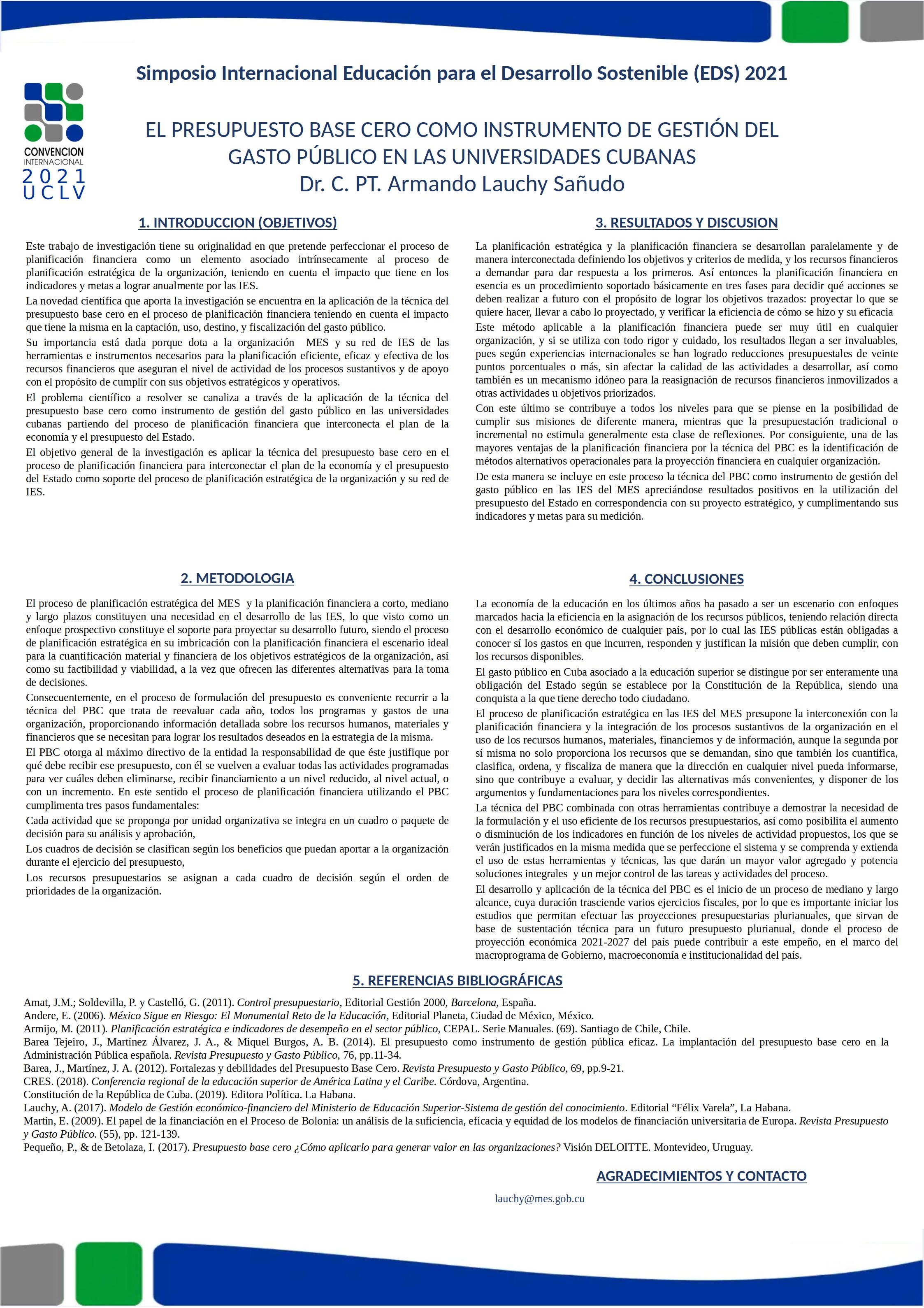 Dr. C. PT. Armando Lauchy Sañudo, email (lauchy@mes.gob.cu), Ministerio de Educación Superior. Cuba.