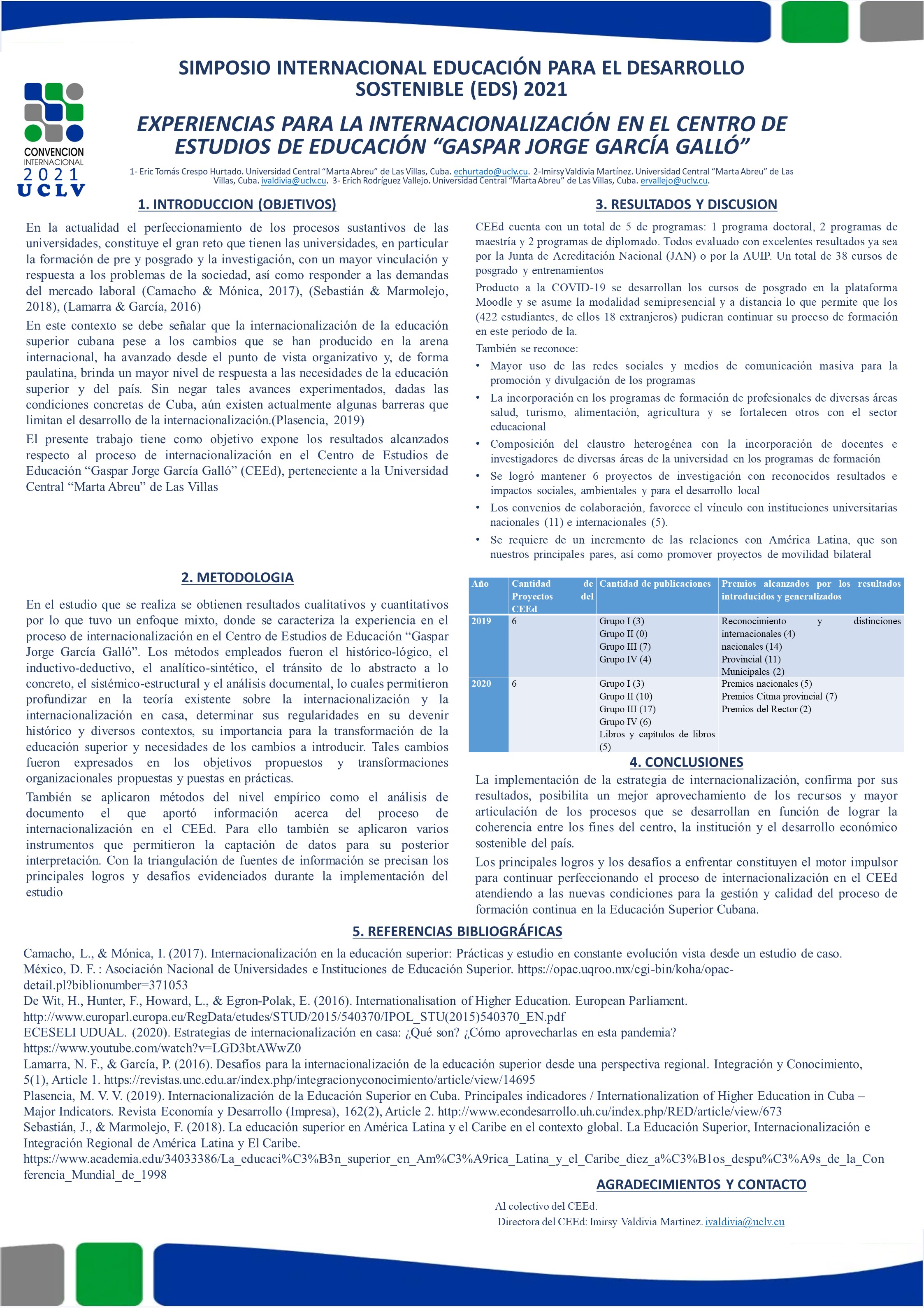 Problem: Internationalization has aroused interest in Cuban researchers in recent years. There have been several contributions from practice and theory for the development of this process in Higher Education. However, a larger scientific and innovative activity is still needed to allow further development. Objective: This article presents the results achieved regarding the internationalization process in the Center for Education Studies "Gaspar Jorge García Galló" (CEEd), belonging to the Central University "Marta Abreu" of Las Villas. Methodology: Through the bibliographic review, the systematization of work experiences and work with various quality indicators that comprise a period of time between 2019 and 2021, the fundamental characteristics of the subject are reached and the main achievements and achievements are exposed. Weaknesses achieved in the implementation of the Strategic Internationalization Plan drawn up for this purpose in the CEEd, however, since 2020 COVID-19 has been present worldwide, imposing a new challenge for our actions. Results and discussion: Results are offered on the publications, events, awards and work on projects for years, the trend of the ongoing training process that is carried out and the main transformations that are assumed is analyzed. Conclusions: Based on the results achieved, there are achievements that favor the continuous development of internationalization. The main achievements and the challenges to be faced constitute the essence of this work.