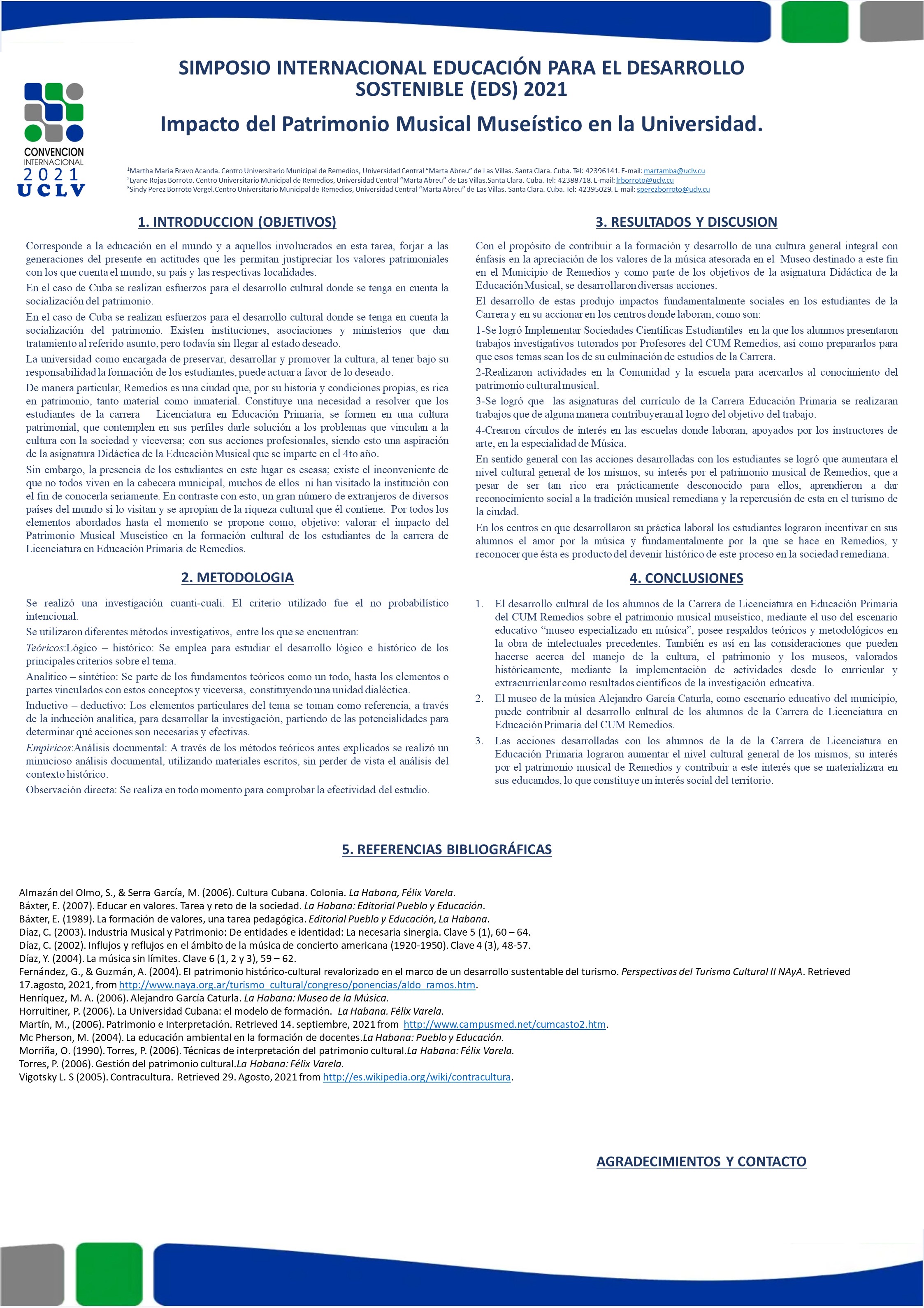 La universidad en el cumplimiento de su misión de preservar, desarrollar y promover la cultura de la humanidad, se encarga de la preparación integral de los estudiantes, sin restringirse a la formación profesional únicamente. Lo anterior supone que los egresados de las distintas carreras estén capacitados para interactuar armónicamente con el entorno comunitario y satisfacer así el encargo social. De esta manera, se infiere que los estudiantes de la Carrera Licenciatura Educación Primaria del CUM de Remedios, necesitan un acercamiento profundo al patrimonio musical museístico, dado que esta ciudad posee su identidad en el patrimonio, incluyendo el musical y el museal, con el cual han de interactuar consecuentemente desde la comunidad misma. Ese componente de la cultura general de los alumnos, no se encuentra en el estado deseado. Ante esa realidad se efectúa la presente investigación para desarrollar la cultura de los alumnos en el patrimonio musical museístico, utilizándose el museo de la música Alejandro García Caturla de esta localidad como escenario educativo, logrando que los estudiantes posean una cultura general integral.