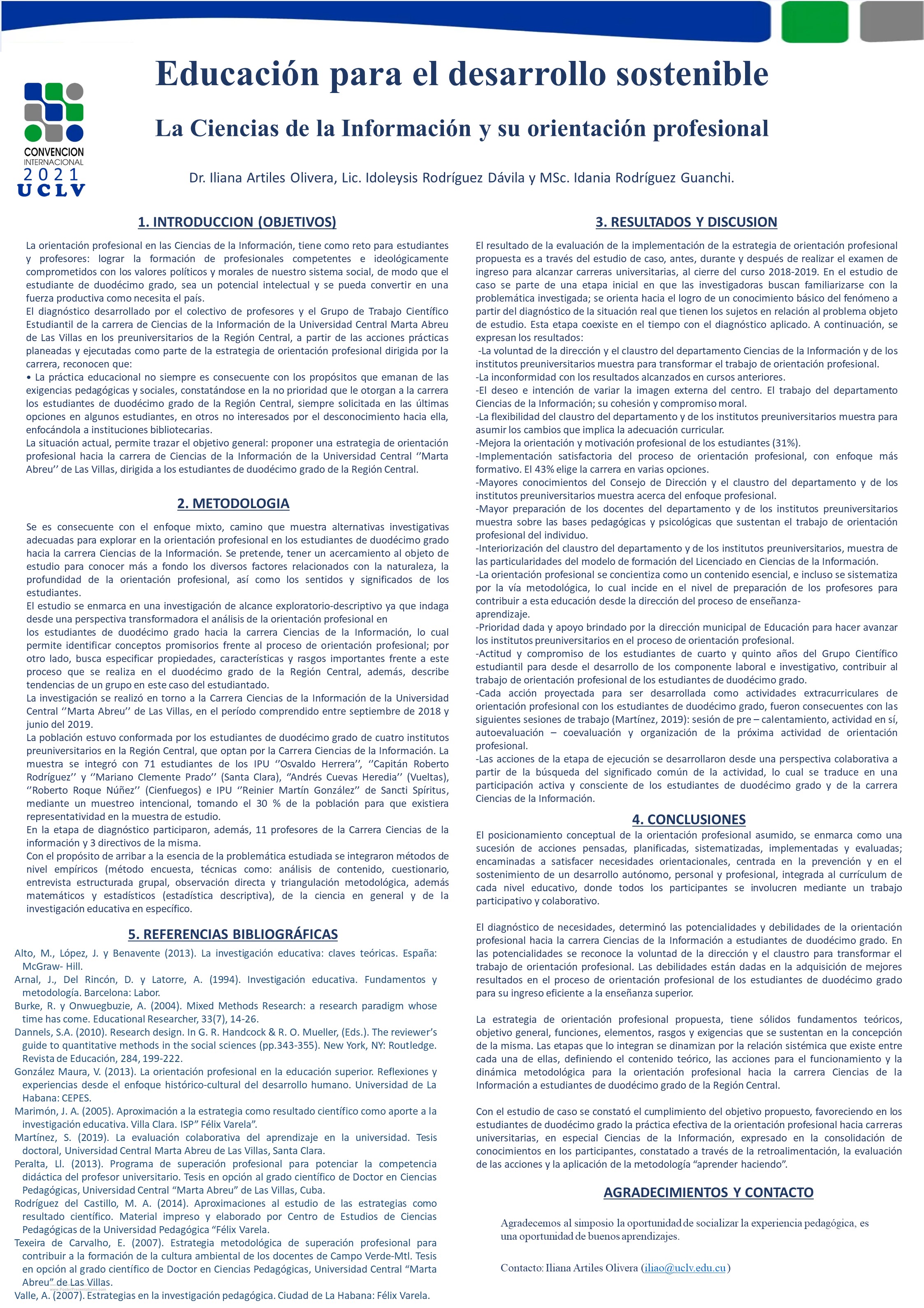 La orientación profesional es decisiva en la vida del individuo por su significación en la selección, formación y actuación profesional, encaminada a que sea el estudiante el centro de este proceso. La presente investigación tiene como objetivo proponer una estrategia de orientación profesional hacia la carrera de Ciencias de la Información de la Universidad Central “Marta Abreu” de Las Villas, dirigida a los estudiantes de duodécimo grado de la Región Central. El trabajo asume el enfoque mixto y en un primer momento se realiza el diagnóstico de las necesidades profesionales en los estudiantes de duodécimo grado de la Región Central con el empleo de métodos y técnicas de corte cuali-cuanti. A partir de las regularidades, se proyecta el resultado científico que potencia la auto determinación, la toma de conciencia y la motivación del estudiante hacia la Ciencias de la Información, posibilitando la construcción reflexiva de su proyecto de vida futura.