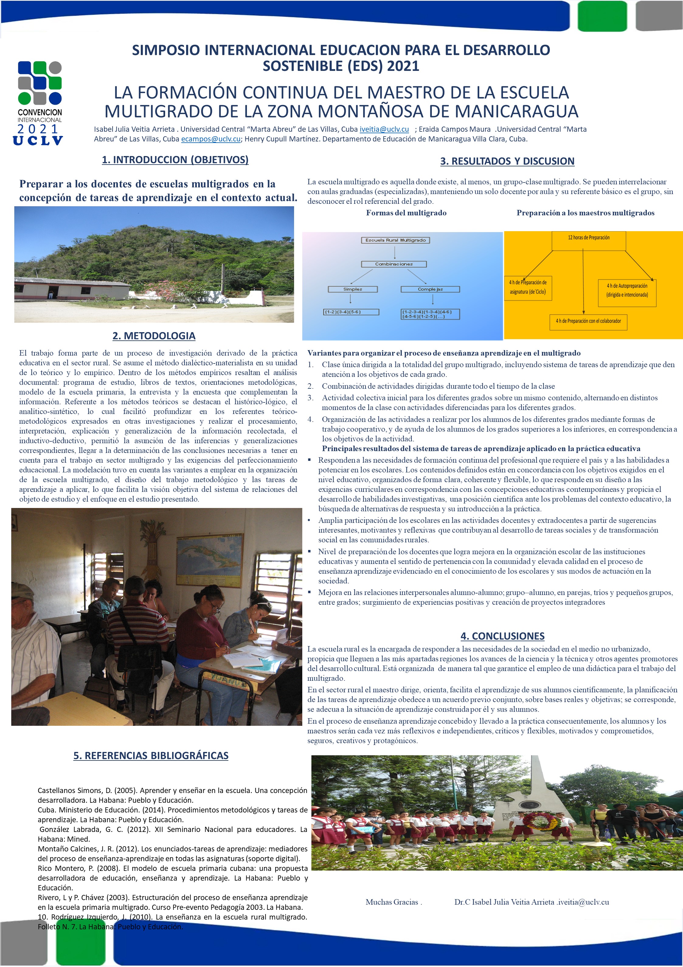 La ponencia aborda como concebir la formación continua del maestro de la escuela multigrado en la concepción de las tareas de aprendizaje en esta institución educativa, lo cual constituye una problemática de gran importancia en el contexto de la realidad cubana actual para contribuir al desarrollo sostenible. Lo anteriormente expresado justifica la necesidad de realizar un estudio teórico y proponer ejemplos de tareas de aprendizaje para la preparación al docente de la enseñanza primaria en las zonas montañosas en Manicaragua; aplicados para incorporar en las clases del grupo multigrado, a partir de la flexibilidad que existe para la planificación de las clases. El objetivo del trabajo es preparar a los docentes de la escuela multigrado en la concepción de tareas de aprendizaje en el contexto actual. El trabajo forma parte de un proceso de investigación derivado del proceso de la práctica educativa en el sector rural. La investigación asume el método dialéctico-materialista en su unidad de lo teórico y lo empírico. Las actividades propuestas constituyen una alternativa que asegura la interrelación entre el docente-escolar, el escolar-con otros escolares y con diversos agentes educativos de su entorno. Se logra el éxito en el proceso enseñanza- aprendizaje pues el docente de multigrado diseña, promueve tareas y situaciones de aprendizaje que propicien el desarrollo del potencial intelectual de los escolares, en un proceso de comunicación y socialización de experiencias de acuerdo con su capacidad para enfrentar la realidad, de forma reflexiva, crítica y constructiva con grandes dosis de autonomía y autodeterminación.