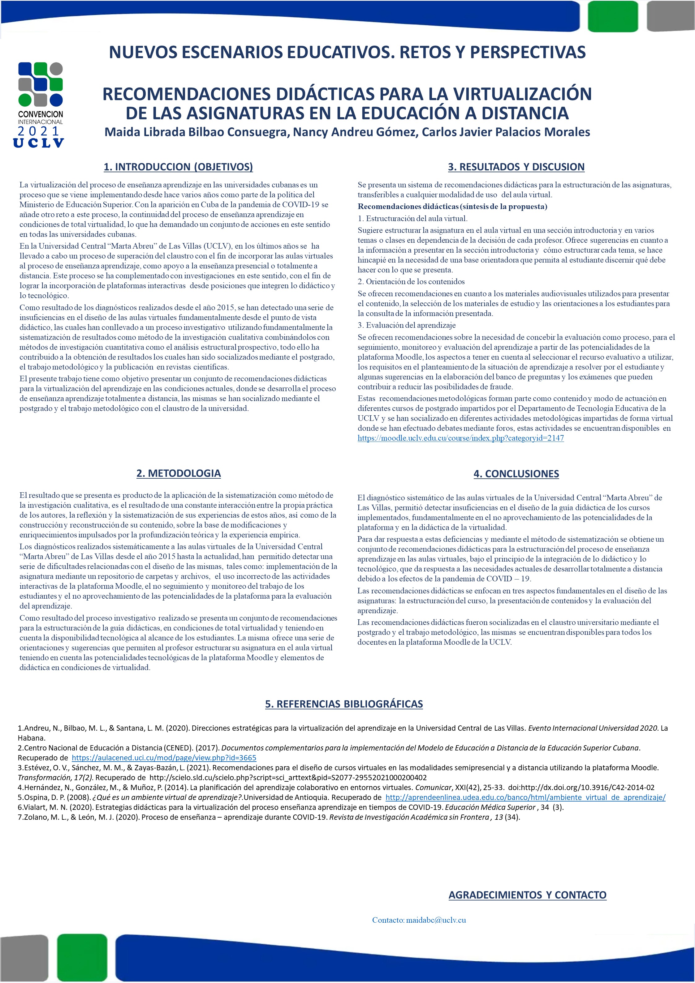 La virtualización del proceso de enseñanza aprendizaje en las universidades cubanas es un proceso que se viene implementando desde hace varios años como parte de la política del Ministerio de Educación Superior. Con la aparición en Cuba de la pandemia de COVID-19 se añade otro reto a este proceso, la continuidad del proceso de enseñanza aprendizaje en condiciones de total virtualidad, lo que ha demandado un conjunto de acciones en este sentido en todas las universidades cubanas. En la Universidad Central “Marta Abreu” de Las Villas, se han desarrollado investigaciones cuyos resultados han permitido enfrentar esta nueva situación. Como resultado de la aplicación de la sistematización de experiencias se obtiene un conjunto de recomendaciones didácticas para la implementación de las aulas virtuales en la modalidad a distancia. Estas recomendaciones didácticas basadas en el principio de la integración de los didáctico y lo tecnológico, incluyen tres aristas fundamentales, la estructuración de los cursos, la presentación de los contenidos y la evaluación del aprendizaje. Este resultado se ha socializado, a través de la vía del postgrado y del trabajo metodológico y se encuentra disponible en la plataforma Moodle para todo el claustro universitario. El presente trabajo tiene como objetivo presentar un conjunto de recomendaciones didácticas para la virtualización del aprendizaje en las condiciones actuales, donde se desarrolla el proceso de enseñanza aprendizaje totalmente a distancia, las mismas se han socializado mediante el postgrado y el trabajo metodológico con el claustro de la universidad.