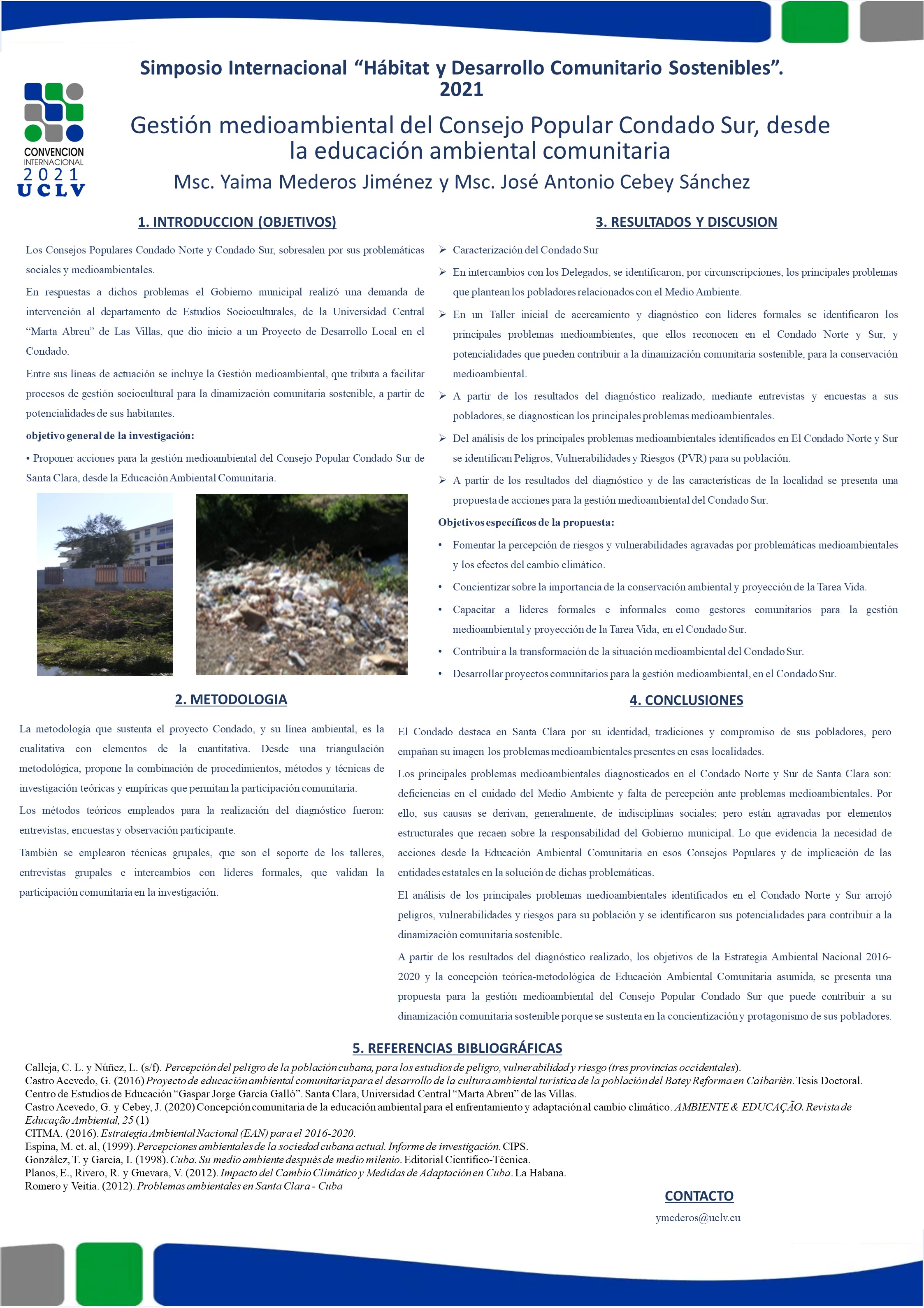 The Popular Councils Condado Norte y Sur, of Santa Clara, have an important historical and sociocultural tradition. However, its social and environmental problems stand out as negative elements. Based on the political will of the municipality and the demand made to the Department of Sociocultural Studies, a Local Development Project was started in the Condado. Its lines of action include Environmental Management, which contributes to facilitating sociocultural management processes for sustainable community dynamization, based on the potential of its inhabitants. As part of the project's environmental line, this research focused on proposing actions for the environmental management of the Condado Sur, of Santa Clara, from the Community Environmental Education. Based on the methodology of the mixed approach, predominantly qualitative, and a methodological triangulation, theoretical and empirical research procedures, methods and techniques are combined. The empirical methods used were: interviews, surveys and participant observation. Group techniques were also used, which constitute the support of the workshops, group interviews and exchanges with formal leaders, which validate community participation in the research. The main results are synthesized in the proposal, designed from the information obtained from the initial diagnosis. Its implementation can mitigate environmental problems in the Popular Council Condado Sur, and with it, dangers, vulnerabilities and risks for its population; contribute to the environmental culture of its inhabitants and to the implementation of the Life Task in that locality.
