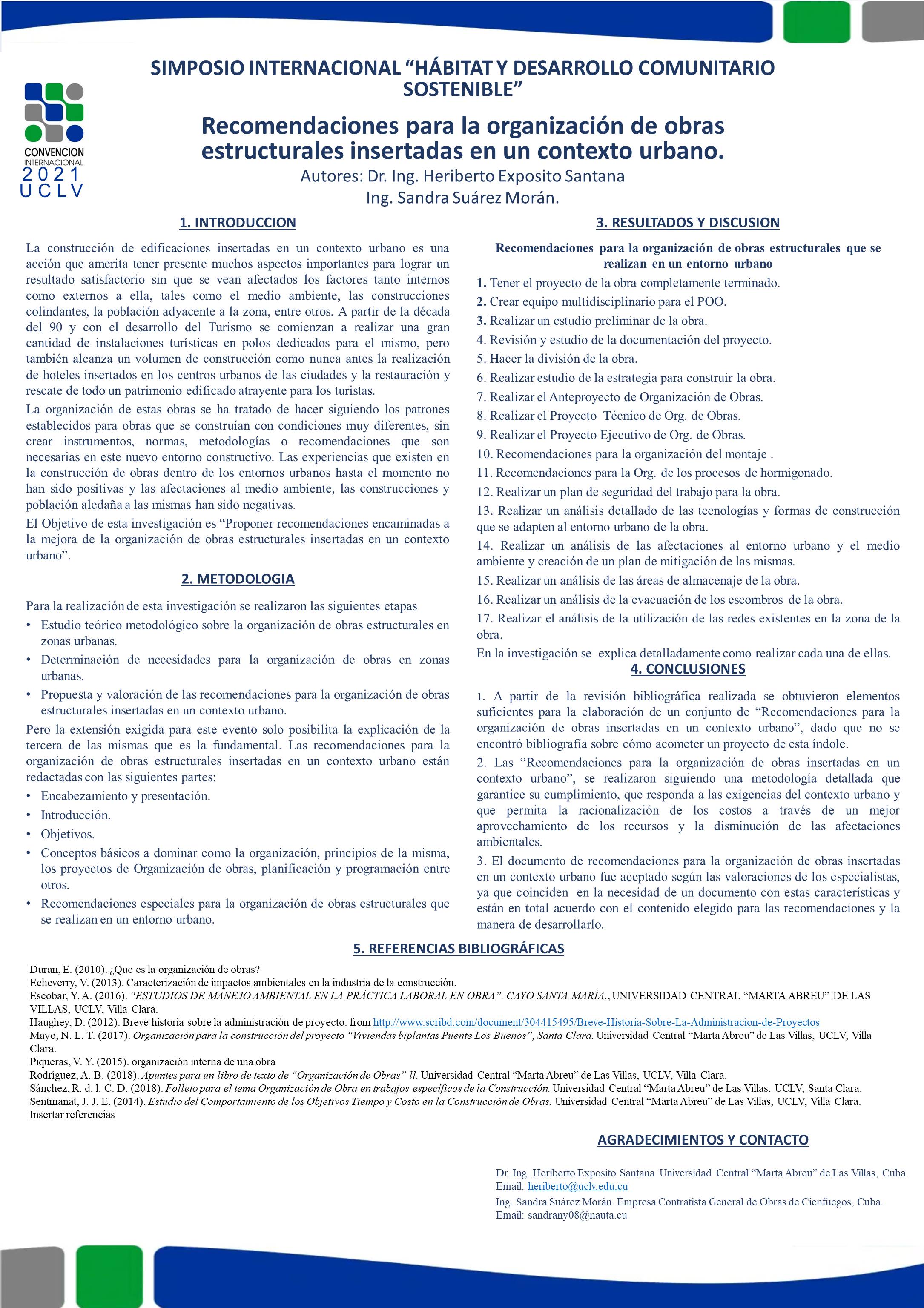 La construcción dentro de las ciudades se puede tornar engorrosa si no se tienen en cuenta numerosos detalles durante su desarrollo, la vía más correcta para evitar todo tipo de inconvenientes es a través de la organización de obra, considerada como una de las claves decisivas en el éxito de una obra. La presente investigación tiene como objetivo proponer recomendaciones encaminadas a la mejora de la organización de obras estructurales insertadas en un contexto urbano. Para su confección se realiza una revisión bibliográfica sobre el tema de organización de obra en zonas urbanas, destacando algunos aspectos a tener en cuenta y que se consideran imprescindibles para organizar un proyecto independientemente de su envergadura, así como el impacto ambiental dentro de ciudades. Luego se realiza una determinación de necesidades a través de encuestas a especialistas y pobladores, así como la revisión de algunos proyectos de organización de obras, confirmando la necesidad de una correcta organización que garantice eficiencia y control en las obras urbanas. También por los métodos aplicados quedan reflejadas algunas experiencias que los especialistas han tenido en los proyectos ejecutados en zonas urbanas y algunas recomendaciones a tener en cuenta para realizar el tercer capítulo, el cual se basa en la elaboración y valoración de la propuesta de recomendaciones encaminadas a la mejora de la organización de obras estructurales insertadas en un contexto urbano.