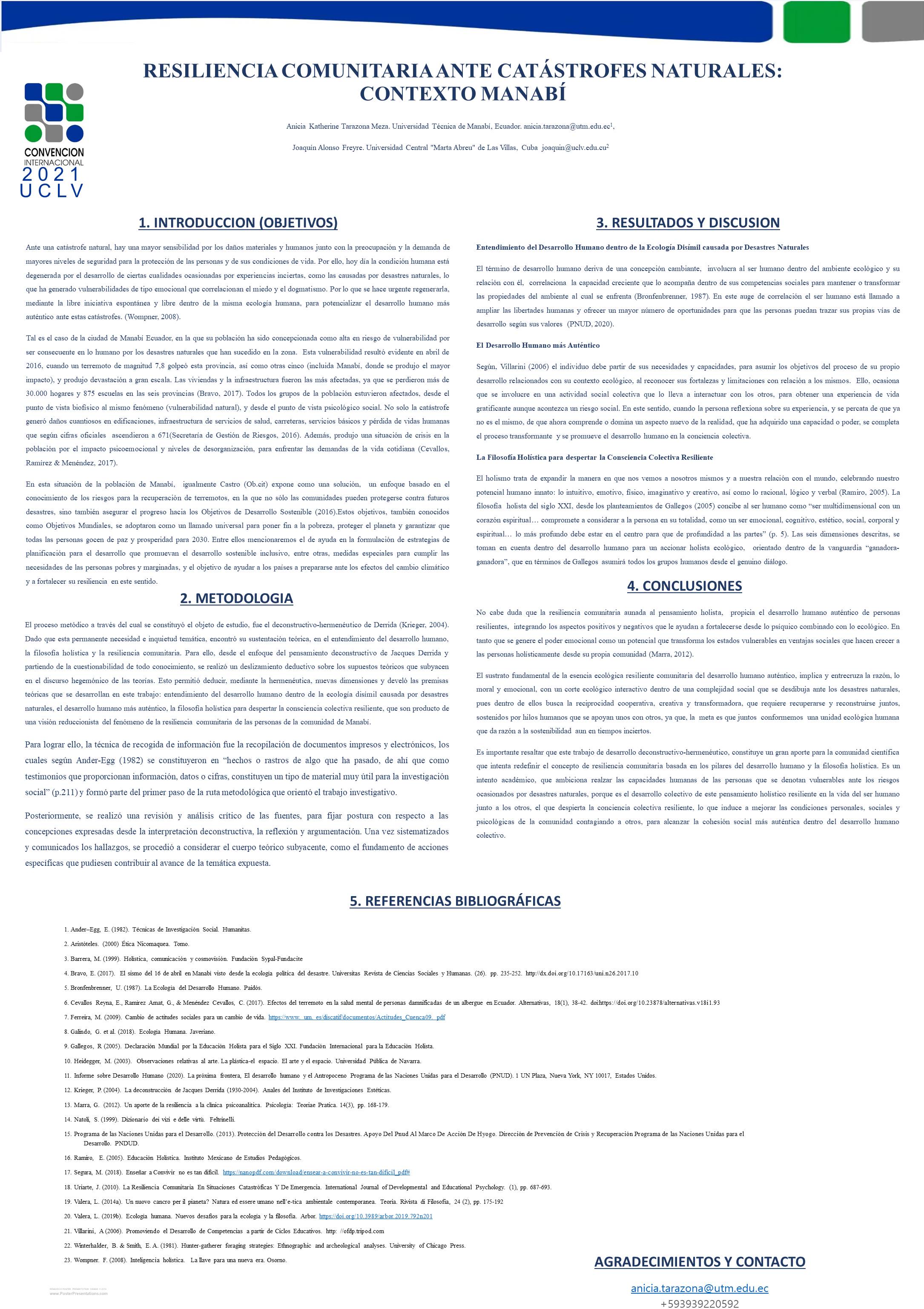 The human condition due to the development of uncertain experiences, such as those caused by natural catastrophes, generates emotional vulnerabilities that correlate fear and dogmatism, as in the population of Manabí, Ecuador. The objective of the study was to reveal the genesis of a more authentic human development based on a holistic philosophy, in which community resilience is the path of high intrinsic and extrinsic value, which stimulates the strengthening of thoughts, emotions and moral behaviors, destined to face the consequences of adversity. The methodical process was Derrida's deconstructive-hermeneutical (Krieger, 2004): deductive sliding on the theoretical assumptions that underlie the hegemonic discourse of theories, to deduce through hermeneutics the deconstructive interpretation, reflection and argumentation of new theoretical dimensions: understanding of human development within the dissimilar ecology caused by natural disasters, the most authentic human development, the holistic philosophy to awaken the resilient collective consciousness. The techniques used were the collection of primary sources. It is concluded that the community resilient ecological essence of authentic human development intersects reason, moral and emotional, with an interactive ecological cut within a social complexity that is blurred by natural disasters, since within them it seeks cooperative reciprocity, creative and transformative, which requires recovering and rebuilding together, supported by human threads that support each other. The goal is that together we form a human ecological unit that gives reason to sustainability even in uncertain times.