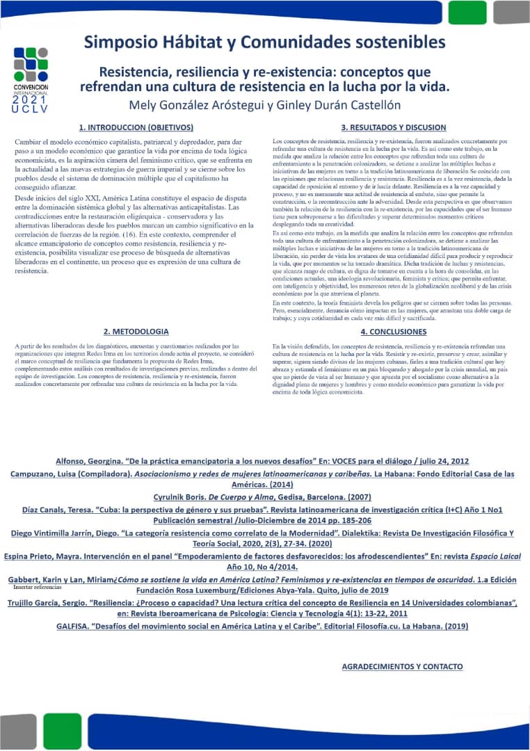 Los conceptos de resistencia, resiliencia y re-existencia, fueron analizados concretamente por refrendar una cultura de resistencia en la lucha por la vida. Es así como este trabajo, en la medida que analiza la relación entre los conceptos que refrendan toda una cultura de enfrentamiento a la penetración colonizadora, se detiene a analizar las múltiples luchas e iniciativas de las mujeres en torno a la tradición latinoamericana de liberación Se coincide con las opiniones que relacionan resiliencia y resistencia. Resiliencia es a la vez resistencia, dada la capacidad de oposición al entorno y de ir hacia delante. Resiliencia es a la vez capacidad y proceso, y no es meramente una actitud de resistencia al embate, sino que permite la construcción, o la reconstrucción ante la adversidad. Desde esta perspectiva es que observamos también la relación de la resiliencia con la re-existencia, por las capacidades que el ser humano tiene para sobreponerse a las dificultades y superar determinados momentos críticos desplegando toda su creatividad. En la visión defendida, los conceptos de resistencia, resiliencia y re-existencia refrendan una cultura de resistencia en la lucha por la vida. Resistir y re-existir, preservar y crear, asimilar y superar, siguen siendo divisas de las mujeres cubanas, fieles a una tradición cultural que hoy abraza y estimula el feminismo en un país bloqueado y ahogado por la crisis mundial.