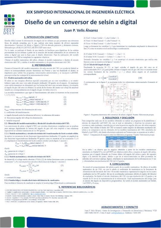 La industria, emplea máquinas eléctricas complejas como los selsines. Este transductor es empleado en los sistemas de seguimiento sincrónico como transmisores y receptores de posición angular. Sustituir estas máquinas eléctricas por otros elementos en ocasiones no es factible porque conlleva modificaciones mecánico-constructivas invasivas, debido a la alta complejidad de integración a los sistemas en que se encuentran acopladas, además de que presentan altas resoluciones, alta robustez ante interferencias eléctricas y fenómenos mecánicos. Por lo que se propone diseñar un conversor de selsín a digital como interfaz de hardware para digitalizar y procesar a través de un modelo matemático las señales provenientes del selsín y obtener la posición angular del transductor. Los objetivos son, obtención del modelo matemático del selsín, modelo matemático del conversor de selsín a digital, desarrollo de la interfaz de hardware y validación del sistema. Durante el desarrollo del trabajo se hace empleo de programas computacionales como Matlab, LabVIEW y Proteus para el diseño y simulación.  Se obtuvo el modelo matemático de un conversor de selsín a digital con una resolución de 0.0219 grados para un conversor de 12 bits con indicación de ángulo en los cuatro cuadrantes del eje de coordenadas cartesiano y no se presentan variaciones en el resultado de la posición angular ante variaciones de la tensión del rotor. Se logró una interfaz de hardware para digitalizar y procesar a través de un modelo matemático las señales provenientes del selsín y obtener la posición angular del transductor.