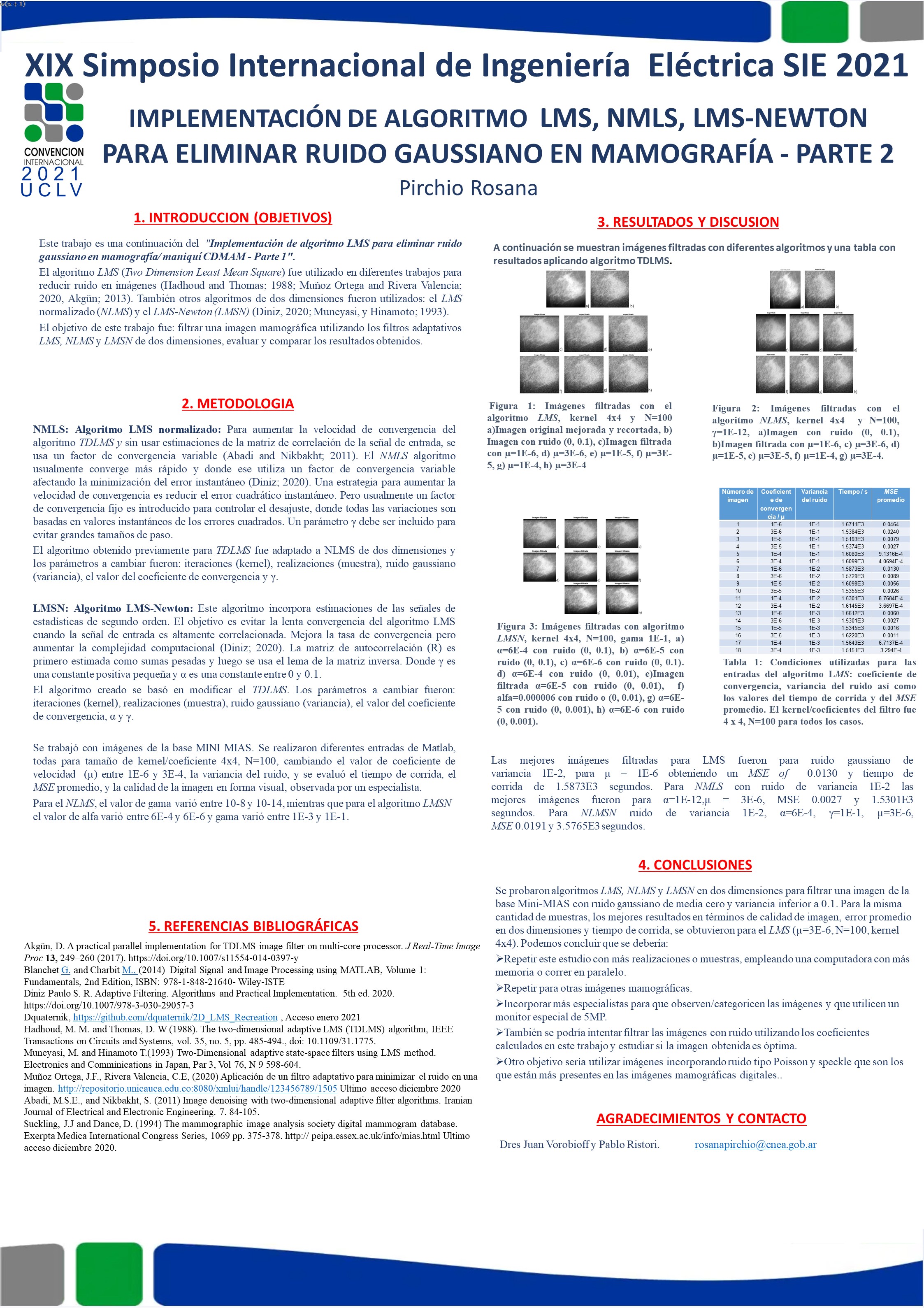 Se partió de una imagen ida de la base mini MIAS y se utilizó el sofware MATLAB 2017A. Se mejoró el contraste y se recortó la parte con lesiones. Se incorporó ruido gaussiano (media 0 y variancia variando entre 1E-3 y 1E-1) y se utilizaron filtros adaptativos de 2D: LMS, LMS normalizado (NLMS) y LMS-Newton (LMSN). El número de realizaciones (N) fue igual a 100, el tamaño del kernel fue 4x4 y se varió el factor de convergencia (µ) entre 1E-6 y 3E-4. Para el NLMS, el valor de gama varió entre 10-8 y 10-14, mientras que para el algoritmo LMSN el valor de alfa varió entre 6E-4 y 6E-6 y gama varió entre 1E-3 y 1E-1.