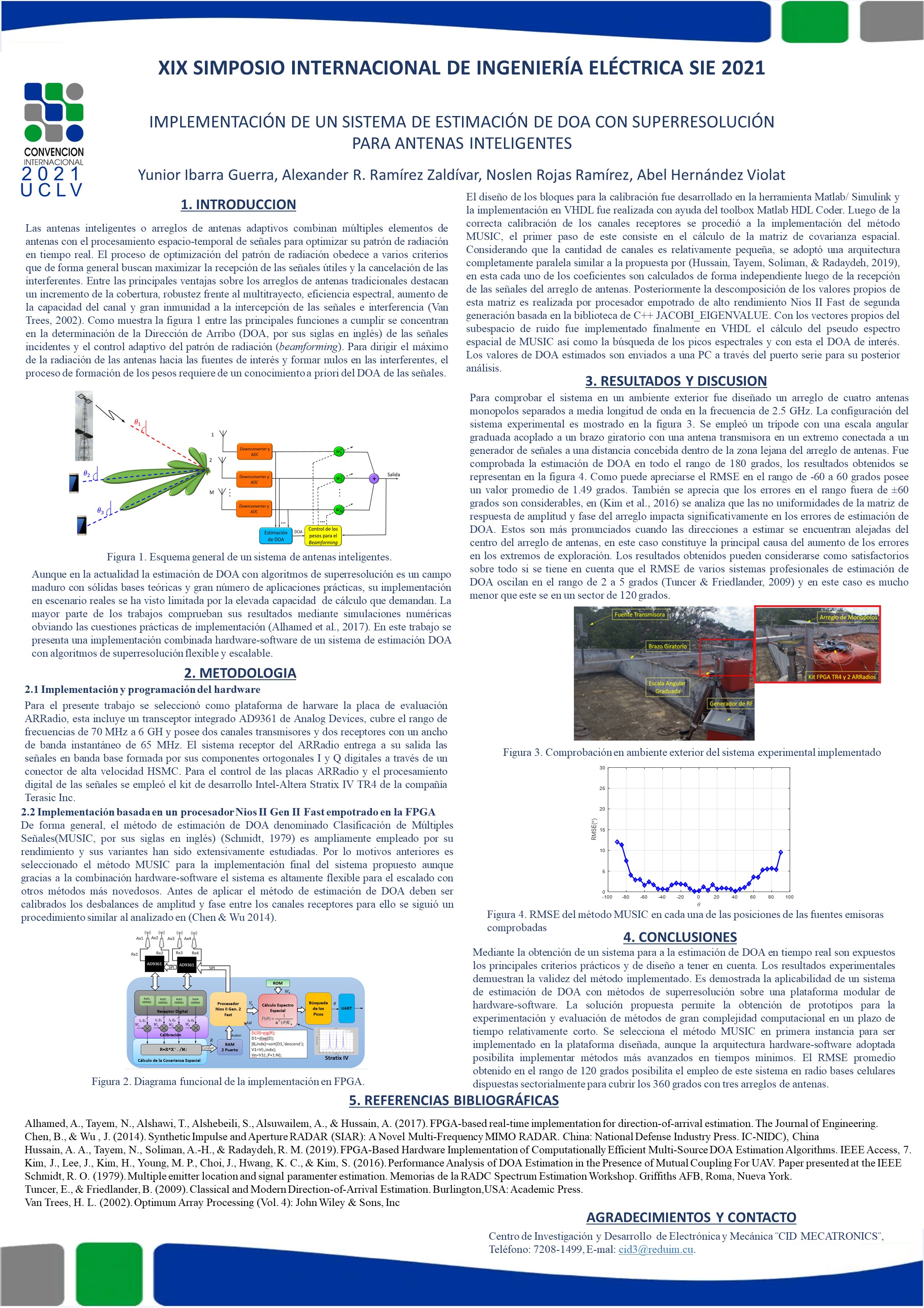 En la actualidad la estimación de la Dirección de Arribo (DOA, por sus siglas en inglés) con superresolución en antenas inteligentes es un campo maduro con sólidas bases teóricas y gran número de aplicaciones prácticas como las comunicaciones inalámbricas, radares, RFID, radio astronomía y medicina por solo citar algunas. Aunque el problema en cuestión ha recibido considerable atención en la literatura científica, su implementación práctica se ha visto limitada por la elevada capacidad de cálculo que demandan, la mayoría de los trabajos publicados evalúa su rendimiento solo mediante simulaciones numéricas. En este trabajo se presenta una implementación combinada hardware-software de un sistema de estimación de la dirección de arribo DOA con superresolución para antenas inteligentes. Luego de la simulación computacional del método escogido, se diseña e implementa el sistema empleando un arreglo lineal de antenas y dos radio-transceptores integrados multicanales AD9361 controlados por un kit de FPGA conectado a través de un adaptador PCI Express a una computadora. Una interfaz gráfica se desarrolla para visualizar el espectro espacial y valida el correcto funcionamiento del sistema. El procedimiento seguido resalta las principales cuestiones, criterios de diseño y requerimientos a la hora de implementar un sistema de estimación de DOA con superresolución. Además, se propone una solución de hardware modular genérica sin la necesidad de diseño de placas de circuito impreso personalizadas para su empleo de banco de prueba con métodos novedosos y de mayor complejidad.