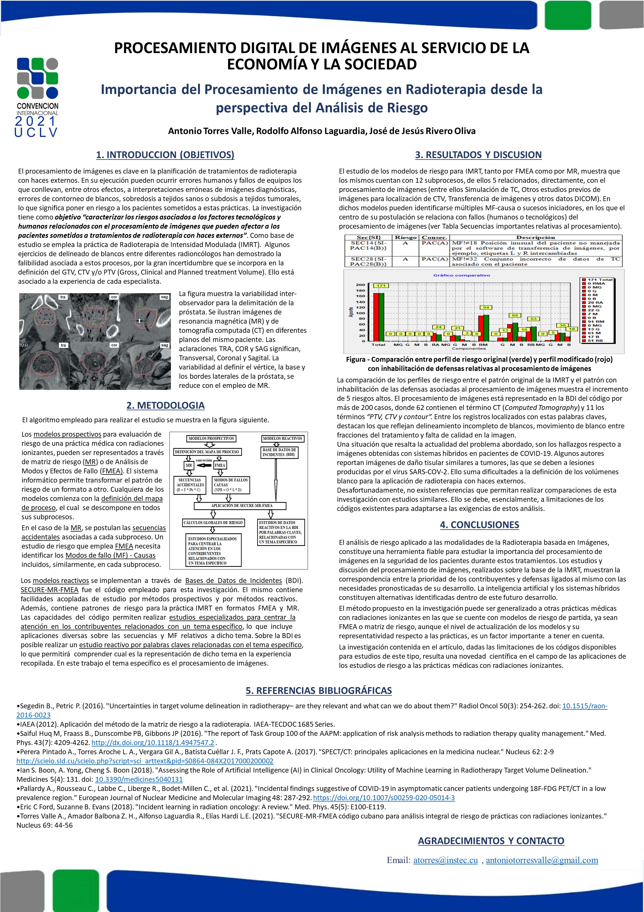 El procesamiento de imágenes es clave en la planificación de tratamientos de radioterapia con haces externos. En su ejecución pueden ocurrir errores humanos y fallos de equipos los que conllevan, entre otros efectos a, interpretaciones erróneas de imágenes diagnósticas, errores de contorneo de blancos, sobredosis a tejidos sanos o subdosis a tejidos tumorales, lo que significa poner en riesgo a los pacientes sometidos a estas prácticas. La investigación tiene como objetivo caracterizar los riesgos asociados a los factores tecnológicos y humanos relacionados con el procesamiento de imágenes que pueden afectar a los pacientes sometidos a tratamientos de radioterapia con haces externos. Como base de estudio se emplea la práctica de Radioterapia de Intensidad Modulada (IMRT). Para caracterizar los iniciadores y las medidas de defensa relacionados con este procesamiento, se emplean modelos de riesgo basados en FMEA y matriz de riesgo de la práctica de referencia, los que son procesados con el software SECURE-MR-FMEA. Los resultados muestran, a través de análisis de sensibilidad, los efectos sobre el riesgo de los fallos asociados a dicho procesamiento. Las conclusiones confirman la importancia de aplicar el análisis de riesgo en el procesamiento de imágenes para elevar la seguridad de los pacientes durante los tratamientos de radioterapia con haces externos.