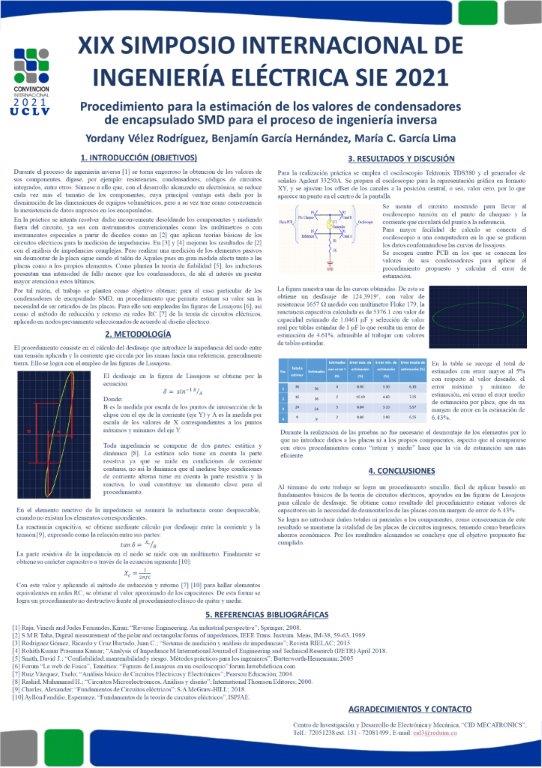 Con el desarrollo tecnológico, se reduce cada vez más el tamaño de los componentes electrónicos, cuya principal ventaja está dada por la disminución de las dimensiones de equipos volumétricos, pero a su vez trae como consecuencia la inexistencia de datos impresos en los encapsulados de los componentes. Esto afecta los trabajos de ingeniería inversa, haciéndolos casi imposibles, por lo que se plantea la posibilidad de obtener un procedimiento para calcular los valores de los condensadores que no poseen en su encapsulado dicha información. Con el empleo de las figuras de Lissajous para determinar el desfasaje entre la tensión y la corriente que introduce una impedancia y con el empleo del método de reducción y retorno en redes RC se logra obtener el valor de capacidad de los condensadores con la ventaja de no dañar a la placa de circuito impreso ni al propio componente. Se seleccionaron 4 placas diferentes con un total de 85 condensadores con valores conocidos, se aplicó el procedimiento propuesto y se obtuvo un error de 6.43% con respecto a los valores deseados. Se concluye que el procedimiento propuesto permite la estimación de los valores de los capacitores con un alto grado de certeza, demostrado en los resultados alcanzados. Su empleo elimina el trabajo de desmontaje de los componentes para su medición. Actualmente ha sido utilizado en los procesos de ingeniería inversa que han tenido lugar en la entidad.