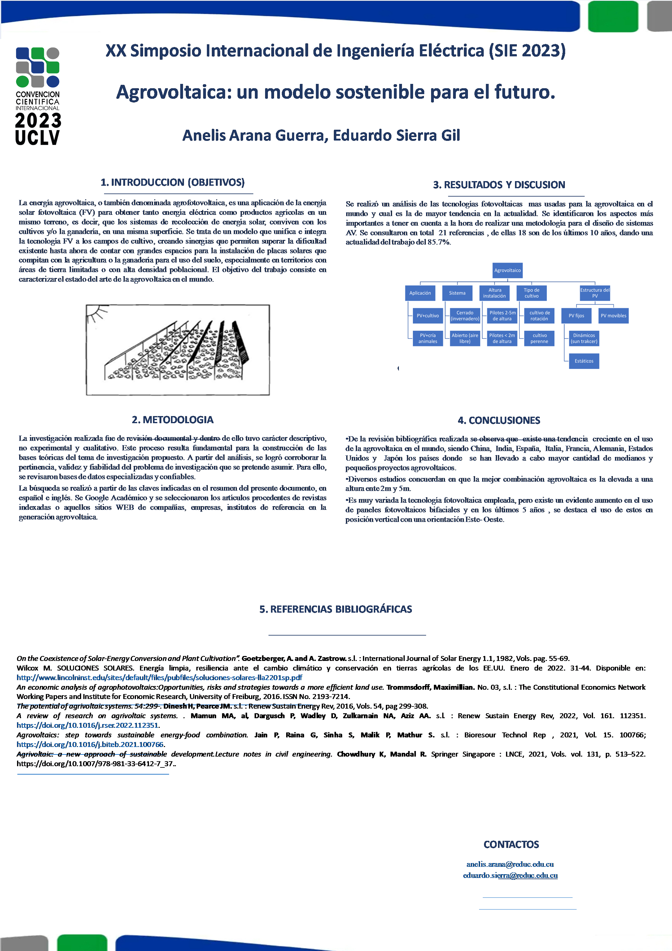Problemática: Se estima que la principal fuente para cubrir el incremento de la demanda de energía limpia y sostenible, provendrá de la energía solar fotovoltaica, pero tiene el potencial de incrementar la competencia por terrenos entre la producción de energía y la producción de alimentos, por esta razón, en los últimos años, la simbiosis de la generación fotovoltaica y la agricultura ha estado presente en la discusión académica y en aplicaciones prácticas en muchos países. En Cuba este es un tema que apenas se comienza a profundizar, siendo el bombeo agrícola, prácticamente su única utilización. Objetivo: Realizar una revisión del estado del arte de la energía agrovoltaica a partir de la exploración sobre diversas combinaciones y tecnologías que hoy se utilizan en varios países del mundo. Metodología: Se realizó una revisión documental y dentro de ello tuvo carácter descriptivo, no experimental y cualitativo. Resultados y discusión: Se muestra que esta compatibilidad incrementa el rendimiento total de un espacio, pero además provoca una oportuna elección de los tipos de cultivo, sus configuraciones, sus instalaciones, en función del suelo, la ubicación, el clima y así influir en una sinergia que se traduce en resiliencia entre la mejora de la producción agrícola y la producción de energía limpia. Conclusiones: La presente revisión bibliográfica constituye la base de posteriores investigaciones sobre la agrovoltaica, para así fomentar el uso de esta tecnología en Cuba, permitiendo el incremento de la generación de energía sostenible, a la vez que se tiene un aumento de la producción agrícola.