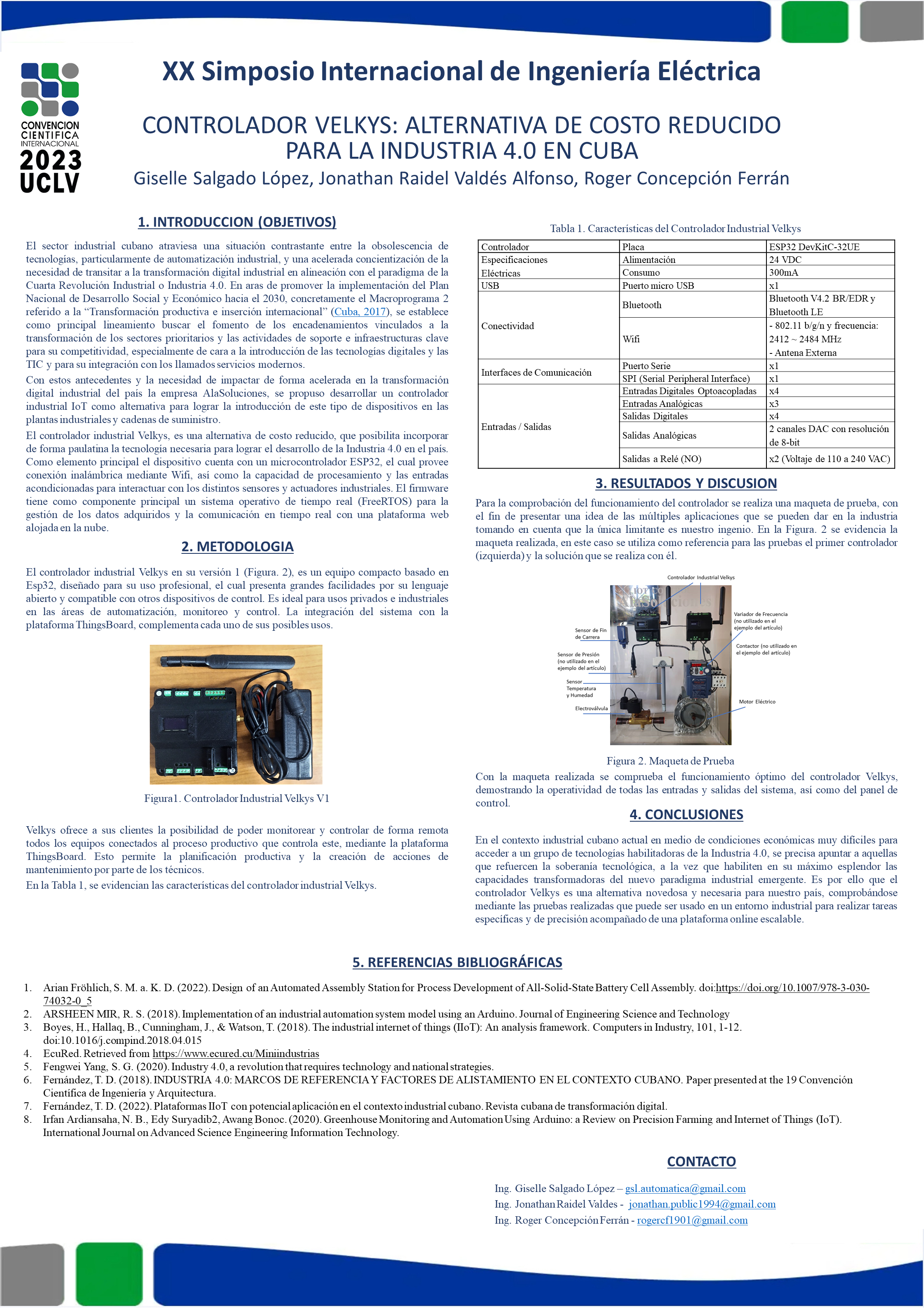 La Industria 4.0 ha revolucionado la forma en que operan las industrias en todo el mundo, permitiendo una mayor eficiencia y optimización de los procesos. Sin embargo, para muchos países en desarrollo, como Cuba, el costo de implementar tecnologías avanzadas puede ser un desafío significativo. En este contexto, el controlador Velkys, desarrollado por la empresa AlaSoluciones, se presenta como una solución de bajo costo para impulsar el desarrollo de la Industria 4.0 en el país. El objetivo de este artículo es demostrar las capacidades del controlador Velkys, presentando el desarrollo hardware y software del dispositivo. Se utiliza como elemento principal el microcontrolador ESP32, el cual provee de conexión inalámbrica mediante Wifi y Bluetooth, así como una potente capacidad de procesamiento. El firmware del controlador se basa en el sistema operativo en tiempo real (FreeRTOS), asegurando una operación eficiente y confiable. Esta solución simplifica la transición hacia la Industria 4.0 en contextos donde la criticidad de los procesos no sea extrema, como en la manufactura liviana y la agroindustria, entre otros, representando una alternativa viable y económica para promover la automatización en la industria cubana.