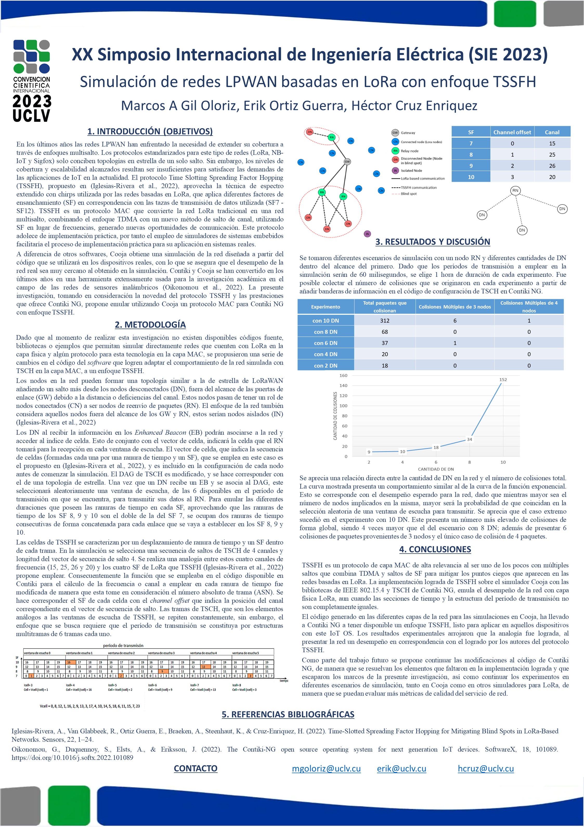 En el Internet de las Cosas, que revoluciona hoy día la tecnología y la sociedad, las redes LPWAN juegan un papel fundamental. Dentro de estas, destaca la tecnología LoRa por la posibilidad de crear redes privadas propias con su consiguiente autonomía. Existen varios protocolos en la capa de acceso al medio (MAC, por sus siglas en inglés) con múltiples saltos para LoRa, entre ellos destaca el novedoso TSSFH, por el empleo de Acceso Múltiple por División de Tiempo (TDMA, por sus siglas en inglés) y múltiples factores de ensanchamiento (SF, por sus siglas en inglés), así como por su enfoque en la mitigación de los puntos ciegos que aparecen en las redes LoRa de un solo salto. Este protocolo adolece de una implementación práctica, por lo que el empleo de simuladores de sistemas embebidos facilitaría el proceso de implementación práctica de la teoría propuesta para su aplicación en sistemas reales. El presente trabajo se centra en la simulación de redes con enfoque TSSFH, con la implementación del protocolo en Contiki NG, a partir de la analogía que se propone en la capa física y las modificaciones hechas en las bibliotecas de IEEE 802.15.4 y TSCH. La herramienta de simulación elegida es Cooja, en la que las corridas de simulación permitieron evaluar el comportamiento de la red, basado en métricas de calidad. Como resultado se obtuvo que el desempeño de la red se comporta acorde a lo esperado para este protocolo, validando así los cambios al código de Contiki NG.