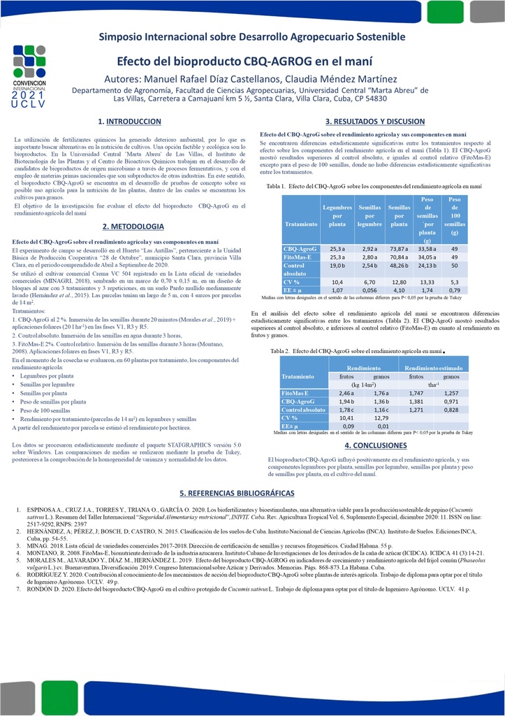 Con el objetivo de evaluar el efecto del bioproducto CBQ-AgroG sobre el rendimiento agrícola y sus componentes en maní, se desarrolló una investigación en el Huerto “Las Antillas”, Santa Clara, Villa Clara, en el periodo comprendido de Abril a Septiembre de 2020. Se utilizó el cultivar comercial Crema VC-504, sembrado en un marco de 0,70 x 0,15 m, en un diseño de bloques al azar con 3 tratamientos y 3 repeticiones, en un suelo Pardo mullido medianamente lavado. Como control relativo se utilizó el FitoMas E. Se realizaron tres aplicaciones foliares de los productos utilizados, durante el ciclo del cultivo. Fueron evaluados los componentes del rendimiento agrícola: legumbres por planta, número y peso de semillas por planta, semillas por legumbre y peso de 100 semillas, así como el rendimiento agrícola por tratamiento. Los resultados mostraron un efecto positivo del CBQ-AgroG sobre el rendimiento agrícola y sus componentes en maní, excepto para el peso de 100 semillas, inferiores al FitoMas E, y superiores al control sin tratamiento.
