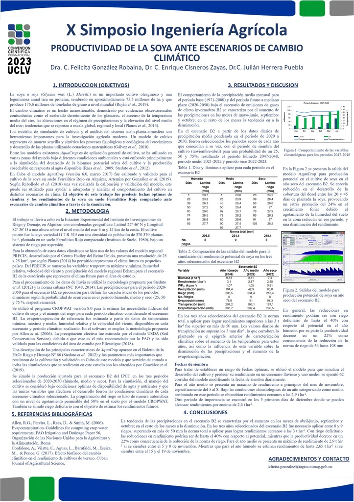 AquaCrop es un modelo de simulación diseñado para el análisis de la productividad de los cultivos en respuesta al agua disponible y evalúa, entre otros, el impacto del cambio climático en el rendimiento. El presente trabajo tiene como objetivo predecir fechas óptimas de siembra y los rendimientos de la soya en suelo Ferralítico Rojo compactado ante escenarios de cambio climático a través de la simulación. Los calendarios de riego se generaron con el Cropwat. En los tres períodos seleccionados del escenario B2 fue necesario aplicar entre 8 y 9 riegos, superando en más de 50 mm la norma total a aplicar para lograr rendimientos superiores a las 3 t ha-1. Si se aplica riego deficitario las reducciones con respecto al potencial se estiman como promedio del 10%. Para un año medio se presenta un máximo de rendimiento de 2,9 t ha-1 si se siembra entre el 5 y 8 de noviembre. Mientras que para un año húmedo se estiman rendimientos de hasta 2,65 t ha-1 si se siembra entre el 15 y el 19 de noviembre. AquaCrop mostró ser una alternativa viable para reproducir la fenología y productividad del cultivo bajo diferentes escenarios de manejo y variabilidad climática.