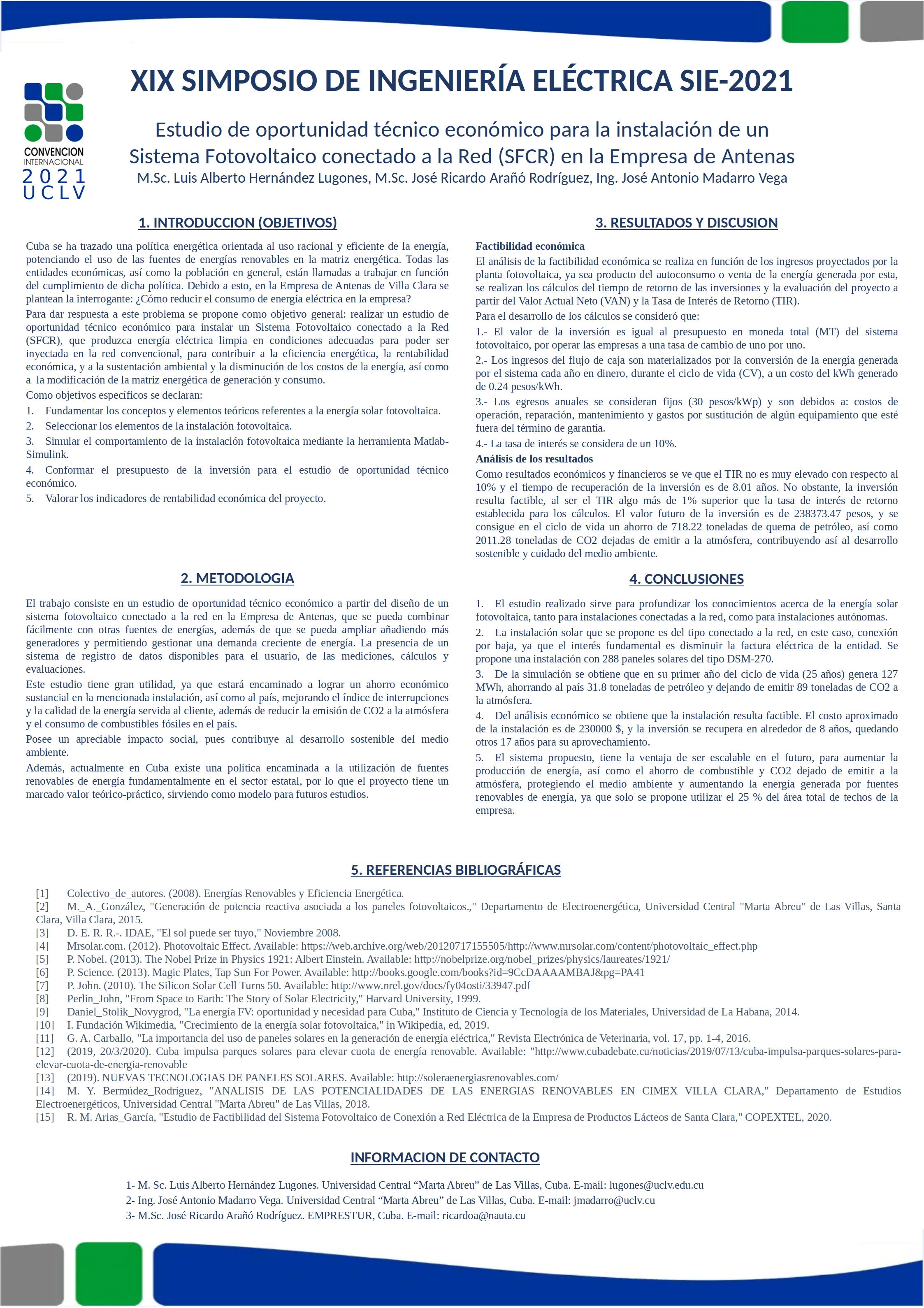 A través de la historia, el consumo de energía ha marcado el progreso de la sociedad, en los últimos años ha sido necesario la búsqueda de nuevas fuentes de energía. Teniendo en cuenta dicho problema, en este trabajo se hace énfasis en la energía solar fotovoltaica, por su gran flexibilidad en su empleo e instalación, se plantea como objetivo general hacer un estudio de oportunidad para la instalación de un parque solar fotovoltaico conectado a la red en techos de la Empresa de Antenas de Villa Clara, Cuba. Se hace una fundamentación teórica de los temas principales acerca de la energía fotovoltaica y teniendo en cuenta las características del lugar de emplazamiento y del impacto de la radiación en este, se calculan y seleccionan los diferentes elementos del sistema que se propone instalar, así como de las protecciones contra procesos transitorios, se realizan simulaciones de la instalación y se hace un análisis económico que permite concluir que el proyecto es rentable, que la recuperación de la inversión puede lograrse en un tiempo aceptable y se producirían significativos ahorros en combustible dejado de quemar y en desemisiones de CO2 a la atmosfera.