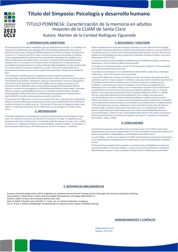 El envejecimiento demográfico mundial es una realidad del actual siglo. Cuba, es uno de los países más envejecidos de América Latina. La reducción del número de hijos por mujer y el aumento de la longevidad resultan determinantes de la estructura etaria de la población. El incremento de la esperanza de vida al nacer y el promedio de años por vivir que conduce al crecimiento de las personas de más de 60 años y da cuentas del envejecimiento poblacional implica un reto para el sistema de salud, y demanda la reorganización de la sociedad, la familia, la producción y los servicios. Ante tal contexto, constituye un imperativo garantizar un envejecimiento exitoso. Para ello, se debe propiciar la adaptación a las nuevas condiciones, físicas, psicológicas y sociales. Con la llegada a la adultez mayor se incrementa el riesgo de padecer afectaciones neuropsicológicas que pueden afectar el funcionamiento cortical, siendo frecuentes las quejas con respecto a la disminución de su calidad de vida por causa del funcionamiento de la memoria. Teniendo en cuenta lo antes referido se define como objetivo general de la investigación: Caracterizar la memoria de los adultos mayores que integran la CUAM en Santa Clara. Se realizó un estudio no experimental, a partir de un diseño transversal descriptivo de tipo mixto. La muestra quedó conformada por 30 adultos mayores y como principales resultados se obtuvieron 2 ancianos con marcadas dificultades en la memoria, 10 con dificultades en la memoria, 17 con buena memoria y uno con muy buena memoria.