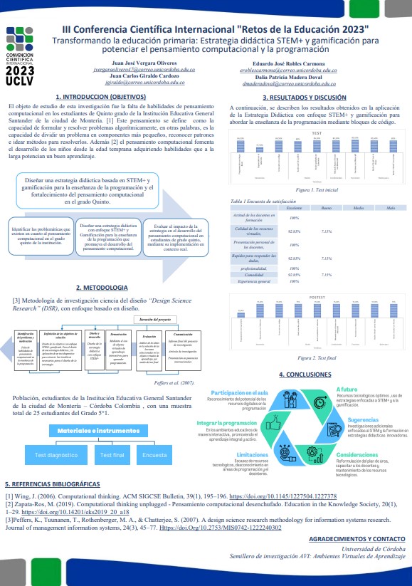 El uso de estrategias didácticas (ED) para desarrollar el pensamiento computacional en estudiantes de primaria se ve limitado por la educación tradicional centrada en contenidos específicos y la falta de integración de la tecnología en la enseñanza de la programación. Este estudio se propuso diseñar e implementar una ED con enfoque STEM+ para la enseñanza de la programación, utilizando la gamificación como estrategia para fortalecer el pensamiento computacional en estudiantes de primaria. Se adoptó una metodología de investigación de ciencia del diseño, que involucró la creación de un prototipo de Objeto Virtual de Aprendizaje con contenido multimedia sobre programación. Se empleó un diseño de comparación pretest-postest para evaluar el impacto de la ED en el aprendizaje de la programación y se administró una encuesta de satisfacción para comprender la experiencia de los estudiantes durante la intervención. Los resultados revelaron una mejora sustancial en las habilidades de pensamiento computacional, con un aumento promedio del 69.2% en las puntuaciones de los postest en comparación con los pretest. Además, el 78% de los estudiantes informó una experiencia educativa altamente positiva en la encuesta de satisfacción. Las conclusiones destacan la eficacia de la gamificación y el uso de recursos digitales para promover el pensamiento computacional en estudiantes de primaria. Se recomienda la integración continua de estrategias didácticas similares en el currículo educativo y la exploración de enfoques colaborativos y STEM+ para mejorar aún más la enseñanza de la programación en las primeras etapas de la educación.