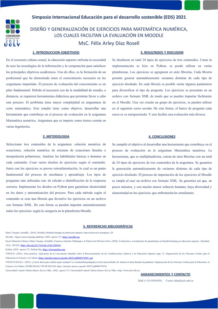 En el escenario cubano actual, la educación superior enfrenta la necesidad de usar las tecnologías de la información y la computación para satisfacer los principales objetivos académicos. Uno de ellos, es la formación de un profesional que ha demostrado tener el conocimiento necesario en las asignaturas impartidas. El proceso de evaluación del conocimiento es un pilar fundamental. Debido al necesario uso de la modalidad de estudio, a distancia, se necesitan herramientas didácticas que permitan llevar a cabo este proceso. El problema tiene mayor complejidad en asignaturas de corte matemático. Este estudio tiene como objetivo, desarrollar una herramienta que contribuya en el proceso de evaluación en la asignatura Matemática numérica. Asignatura que se imparte como tronco común en varias ingenierías. A partir de la experiencia acumulada, se diseñaron varios tipos de ejercicios en diversos temas de la asignatura. Luego se implementaron en Python para generar variantes diferentes. Como resultado se presentan siete librerías de Python útiles para generar variantes aleatorias de los diversos tipos de ejercicios. Los ejercicios se presentan en formato XML, idóneo para ser importados en la plataforma Moodle, la cual se usa actualmente en la UCLV.