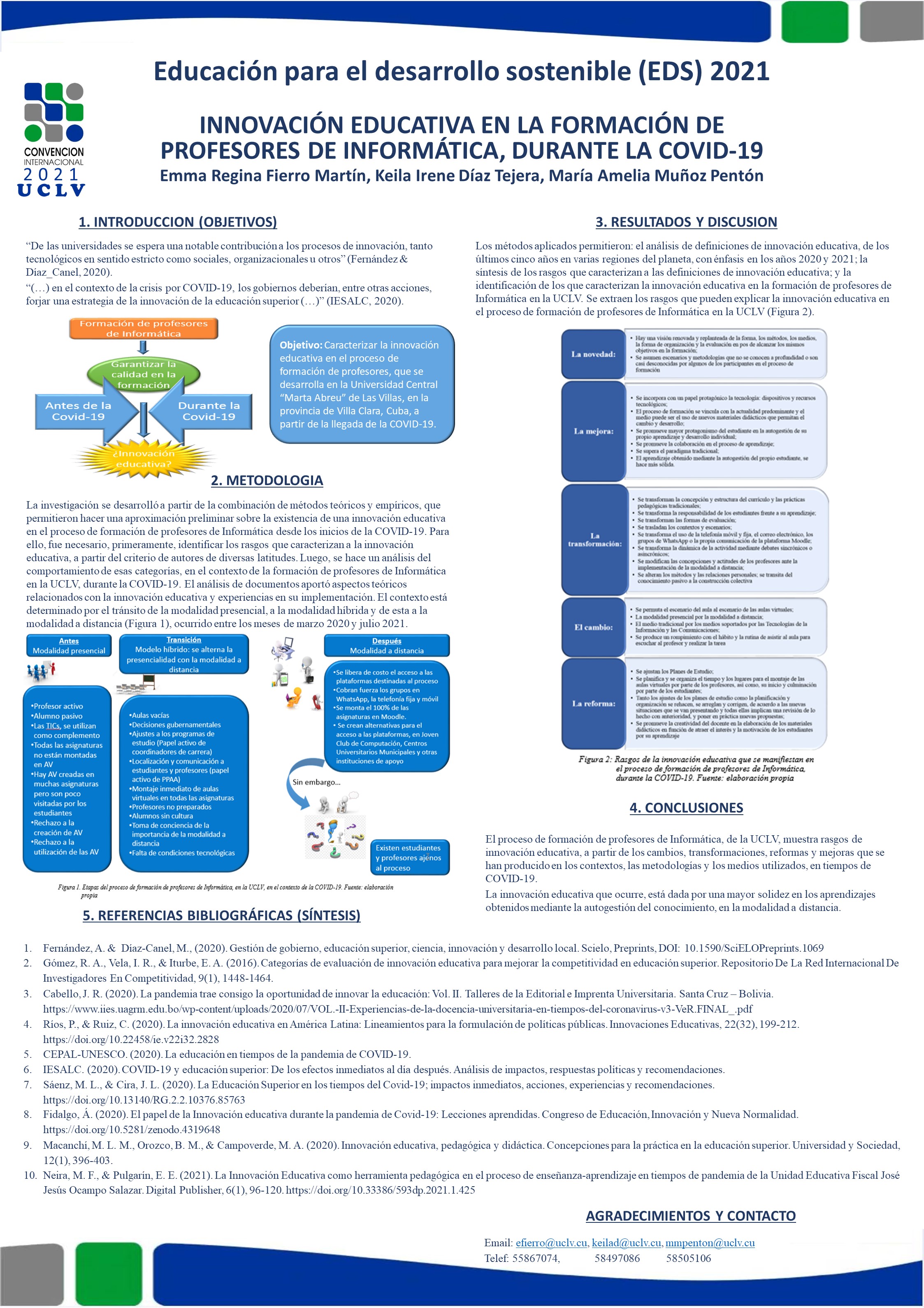 • Objetivo: Caracterizar la innovación educativa en el proceso de formación de profesores, que se desarrolla en la Universidad Central “Marta Abreu” de Las Villas (UCLV), en la provincia de Villa Clara, Cuba, a partir de la llegada de la COVID-19.