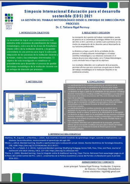 Faced with the problem of obtaining a closer correspondence between the methodological work and the management of university processes; as a premise to guarantee the adequate integration between them, the achievement of the mission, the vision and the institutional strategies to increase the quality; The development of this research was raised aimed at the objective of elaborating a conception of the direction of the methodological work from the approach of management by processes at the "José Martí" Military Technological University. The main methods used in the study are: group work, expert interviews and document analysis. Through an exploratory intervention for the implementation of the proposal, which conditions an integrated management of the directions of the methodological work and other institutional processes, the results that are synthesized in this work are arrived at and it is validated that the process management approach As the basis of the conception of the management of methodological work, it articulates in a systemic way the directions of "methodological teaching work" and "methodological scientific". It makes it possible to specify the meeting points between both directions and between them and other management processes in the HEI, which conditions a better development of the management cycle. It can be stated as a conclusion that the elaboration and implementation of the proposal contributed to reaffirming the positive influence that methodological work has on the preparation of teachers and on the quality of the educational teaching process.