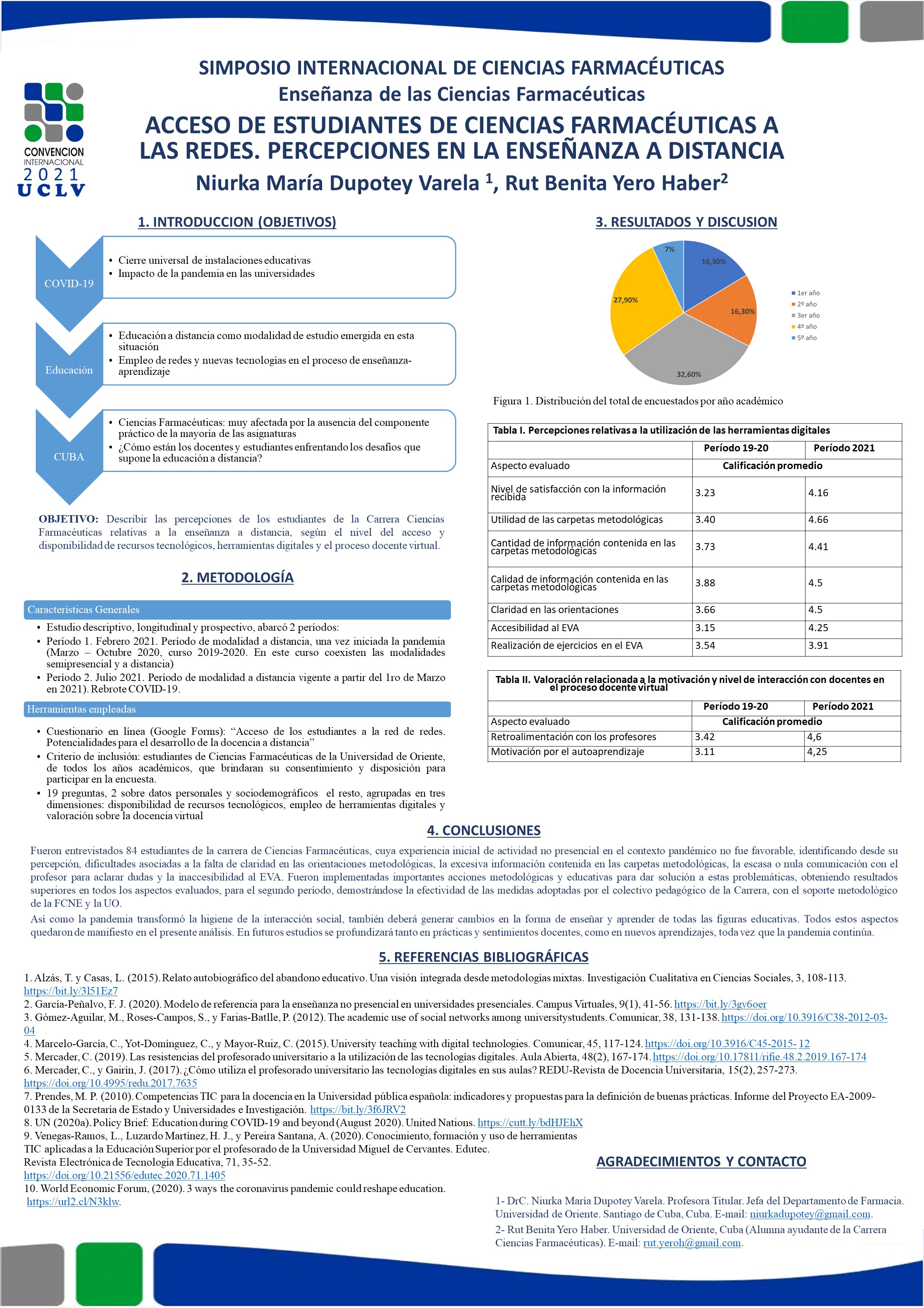 • Objetivo(s): En este contexto, la presente investigación tiene como objetivo describir las percepciones de los estudiantes de la Carrera Ciencias Farmacéuticas relativas a la enseñanza a distancia, según el nivel del acceso y disponibilidad de recursos tecnológicos, herramientas digitales y el proceso docente virtual.