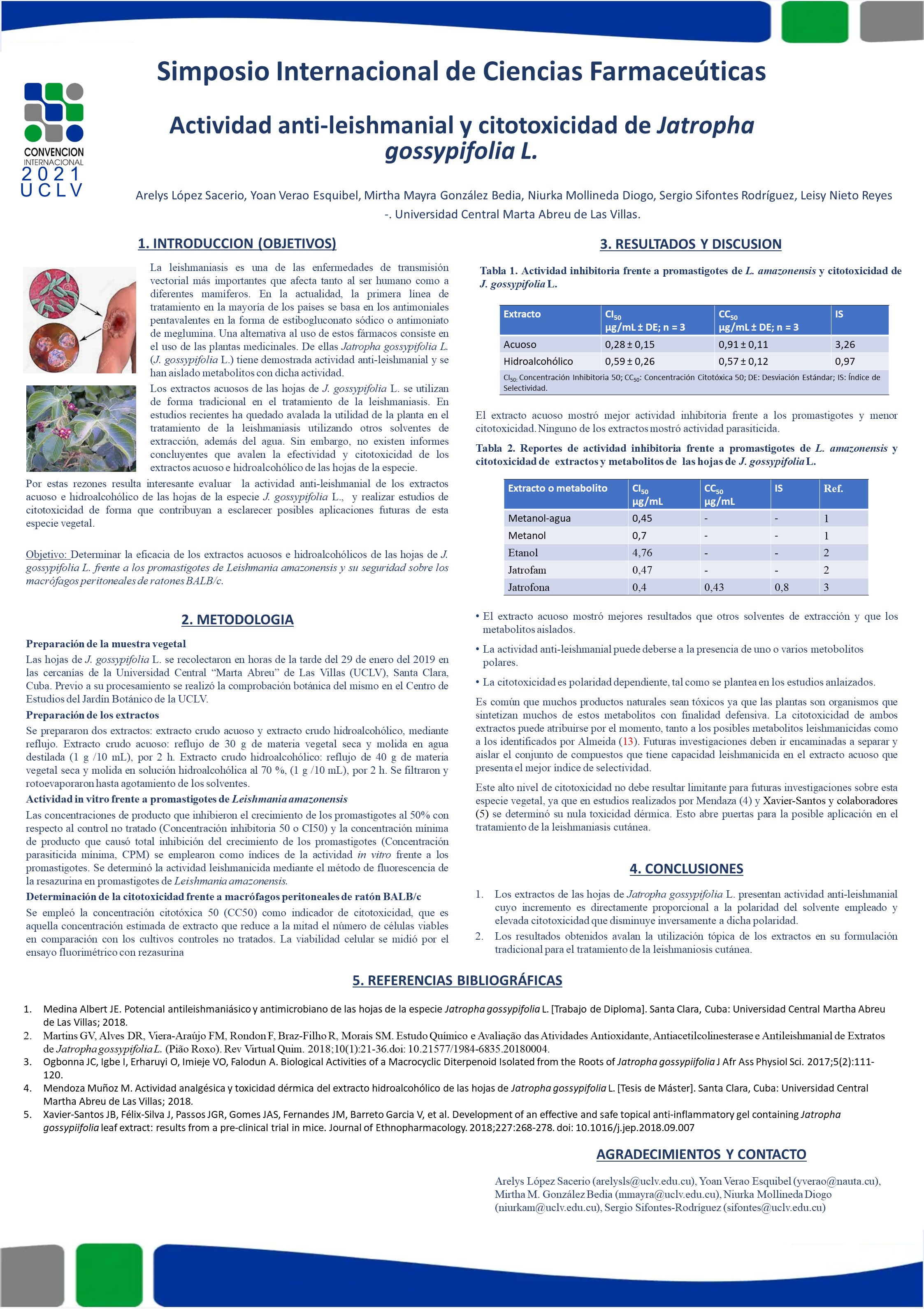 Introduction: Aqueous extracts of the leaves of Jatropha gossypifolia L. are traditionally used in the treatment of leishmaniasis. In recent studies the utility of the plant in the treatment of leishmaniasis has been supported. Although, There are not conclusive reports related to their effectiveness and cytotoxicity.