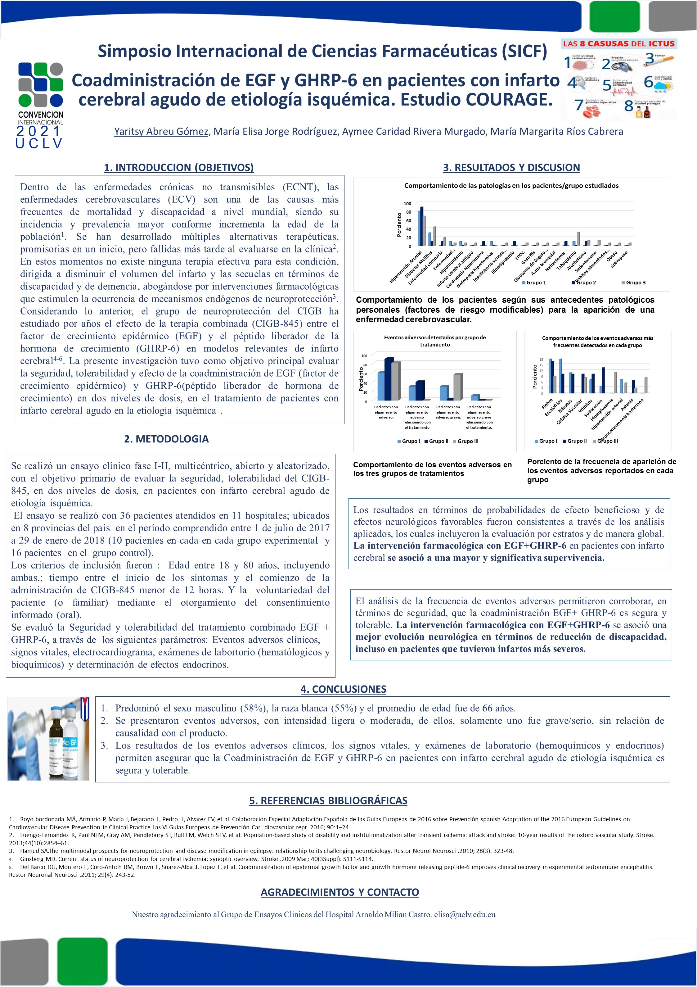 La presente investigación tuvo como objetivo principal evaluar la seguridad, tolerabilidad y efecto de la coadministración de EGF (factor de crecimiento epidérmico) y GHRP-6(péptido liberador de hormona de crecimiento) en dos niveles de dosis, en el tratamiento de pacientes con infarto cerebral agudo en la etiología isquémica. Durante la investigación se determinó la seguridad y la tolerabilidad de la combinación a través de los eventos adversos clínicos, signos vitales, y exámenes de laboratorio; se evaluó el efecto de la coadministración en el infarto cerebral agudo, en cuanto a la reducción de la capacidad medida por la escala Rankin y se evaluó el efecto de coadministración en el nivel de déficit neurológico mediado por la escala NIHSS y por la capacidad de realizar actividades según el índice de Barthel, al egreso y a los 3 y 6 meses post-tratamiento. El estudio abarcó el periodo de julio 2017 a enero 2018. El análisis de la frecuencia de eventos adversos permitieron corroborar, en términos de seguridad, que la coadministración EGF+ GHRP-6 es segura y tolerable. La intervención farmacológica con EGF+GHRP-6 se asoció una mejor evolución neurológica en términos de reducción de discapacidad, incluso en pacientes que tuvieron infartos más severos. Los resultados en términos de probabilidades de efecto beneficioso y de efectos neurológicos favorables fueron consistentes a través de los análisis aplicados, los cuales incluyeron la evaluación por estratos y de manera global. La intervención farmacológica con EGF+GHRP-6 en pacientes con infarto cerebral se asoció a una mayor y significativa supervivencia.