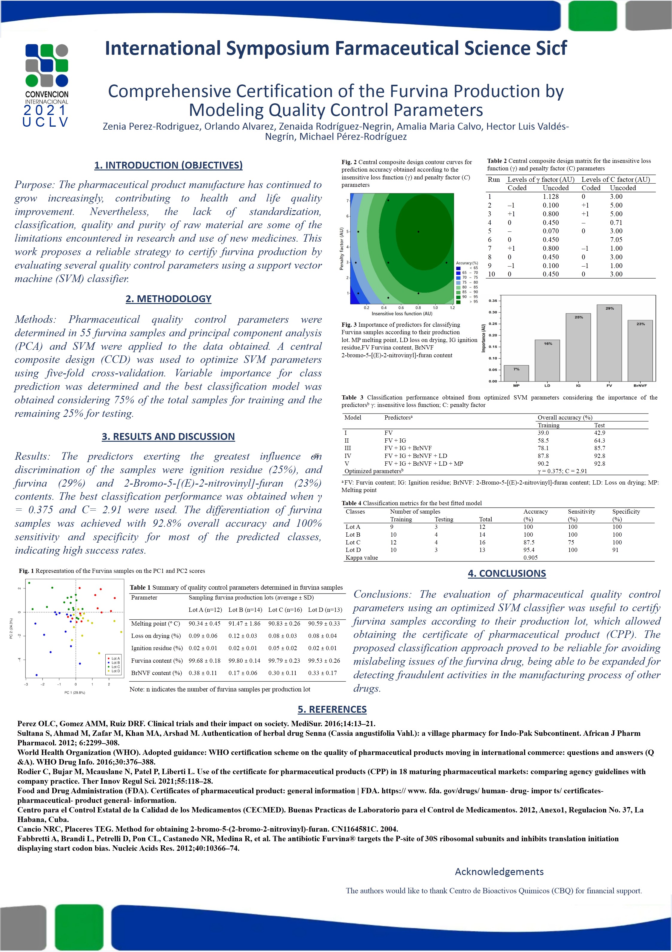 Methods: Pharmaceutical quality control parameters were determined in 55 furvina samples and principal component analysis (PCA) and SVM were applied to the data obtained. A central composite design (CCD) was used to optimize SVM parameters using five-fold cross-validation. Variable importance for class prediction was determined and the best classification model was obtained considering 75% of the total samples for training and the remaining 25% for testing.