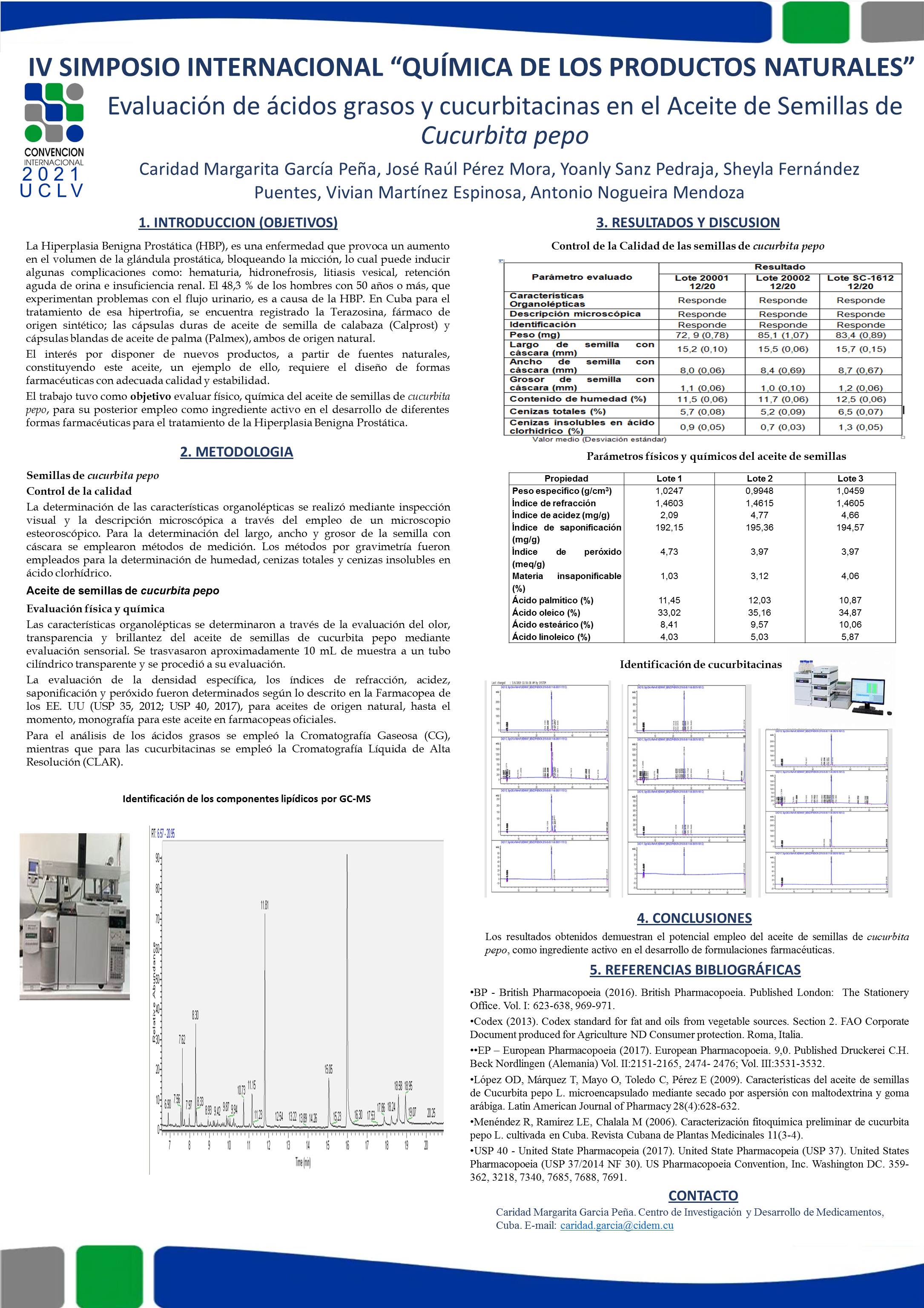 El aceite de semillas de Cucurbita pepo es utilizado desde hace varios años para la prevención y tratamiento de enfermedades inflamatorias de próstata y vejiga. Sin embargo, a pesar del amplio uso que tiene en la población los estudios científicos que avalan su empleo, en Cuba, son escasos. La problemática que se presenta en este estudio científico es obtener evidencias de la composición del aceite para su empleo en el desarrollo de formas farmacéuticas. El trabajo tuvo como objetivo evaluar físico, química del aceite de semillas de cucurbita pepo, para su posterior empleo como ingrediente activo en el desarrollo de diferentes formas farmacéuticas para el tratamiento de la Hiperplasia Benigna Prostática. Metodología: la evaluación físico y química se realizó a través de parámetros establecidos en la Farmacopea de los Estados Unidos para aceites, adicionalmente se evaluaron los perfiles cromatográficos por CLAR y CG. Resultados y discusión: Los parámetros evaluados se encontraron dentro de los límites establecidos para otros aceites vegetales de calidad farmacéutica. Los perfiles cromatográficos mostraron la presencia de cucurbitacinas, por CLAR, y ácidos grasos, por CG, como compuestos mayoritarios. Conclusiones: Los resultados obtenidos demuestran el potencial empleo del aceite de semillas de Cucurbita pepo, como ingrediente activo en el desarrollo de formulaciones farmacéuticas