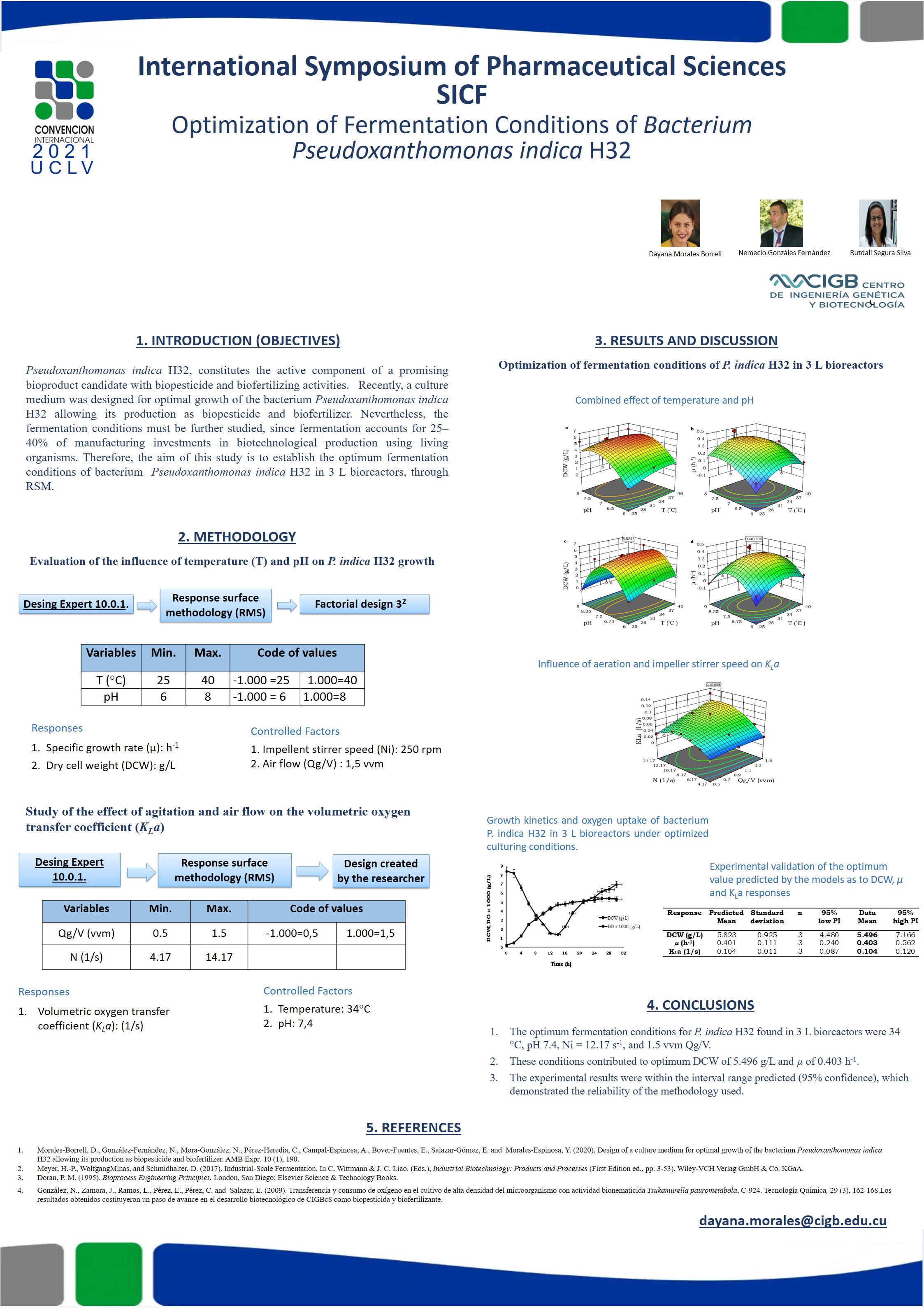 Pseudoxanthomonas indica H32, constitutes the active component of a promising bioproduct candidate with biopesticide and biofertilizing activities. However, suitable fermentation conditions should be established to manufacture this product. Accordingly, the aim of this study was to optimize the fermentation conditions of bacterium Pseudoxanthomonas indica H32 in a 3 L bioreactor. The relevant parameters for strain growth, temperature (25–40 ◦C) and pH (6–9), were optimized using the response surface methodology (RSM). Additionally, the influence of air flow (0.5–1.5 vvm) and impeller stirrer speed (4.17–14.17 s - 1) in the volumetric oxygen