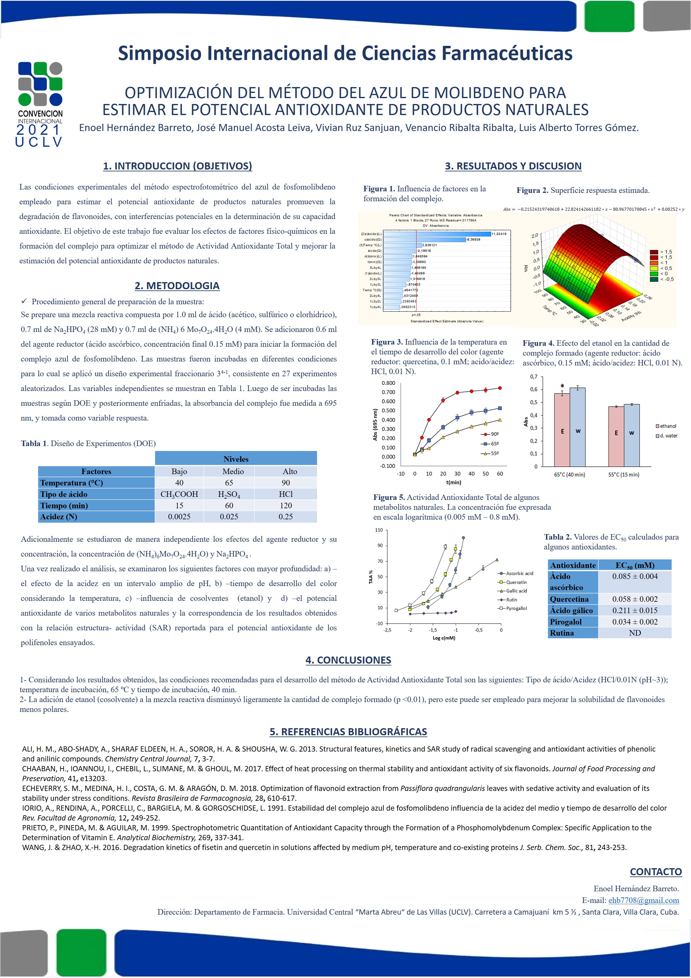 Metodología: Se aplicó un diseño experimental fraccionario 34-1. Las variables independientes fueron temperatura, tiempo de desarrollo del color, tipo de ácido y acidez, y variable dependiente absorbancia del complejo. Se estudiaron independientemente los efectos del agente reductor y su concentración, la concentración de (NH4)6Mo7O24.4H2O) y Na2HPO4 . Luego fueron evaluados el tiempo de desarrollo del color considerando temperatura e influencia de cosolventes y el potencial antioxidante de metabolitos naturales.