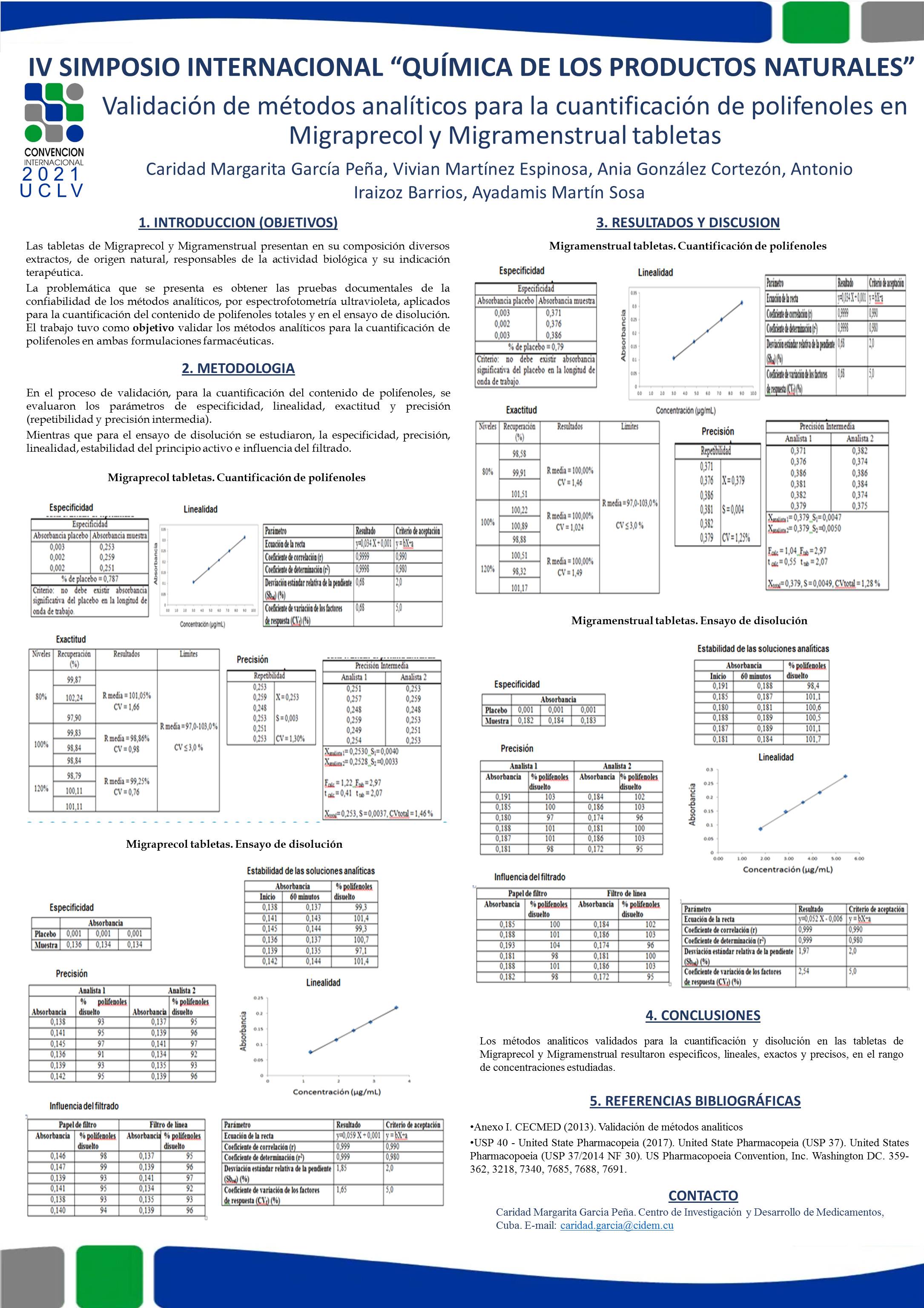 Las tabletas de Migraprecol y Migramenstrual presentan en su composición diversos extractos, de origen natural, responsables de la actividad biológica y su indicación terapéutica. La problemática que se presenta es obtener las pruebas documentales de la confiabilidad de los métodos analíticos, por espectrofotometría ultravioleta, aplicados para la cuantificación del contenido de polifenoles totales y en el ensayo de disolución. El trabajo tuvo como objetivo validar los métodos analíticos para la cuantificación de polifenoles en ambas formulaciones farmacéuticas. Metodología: en el proceso de validación, para la cuantificación del contenido de polifenoles, se evaluaron los parámetros de especificidad, linealidad, exactitud y precisión (repetibilidad y precisión intermedia). Mientras que para el ensayo de disolución se estudiaron, la especificidad, precisión, linealidad, estabilidad del principio activo e influencia del filtrado. Resultados y discusión: los resultados obtenidos en los estudios de validación realizados, en la evaluación de los parámetros evaluados se encontraron dentro de los límites establecidos, por nuestro órgano regulador (CECMED) para la validación de métodos analíticos. Conclusiones: los métodos analíticos validados para la cuantificación y disolución en las tabletas de Migraprecol y Migramenstrual resultaron específicos, lineales, exactos y precisos, en el rango de concentraciones estudiadas.