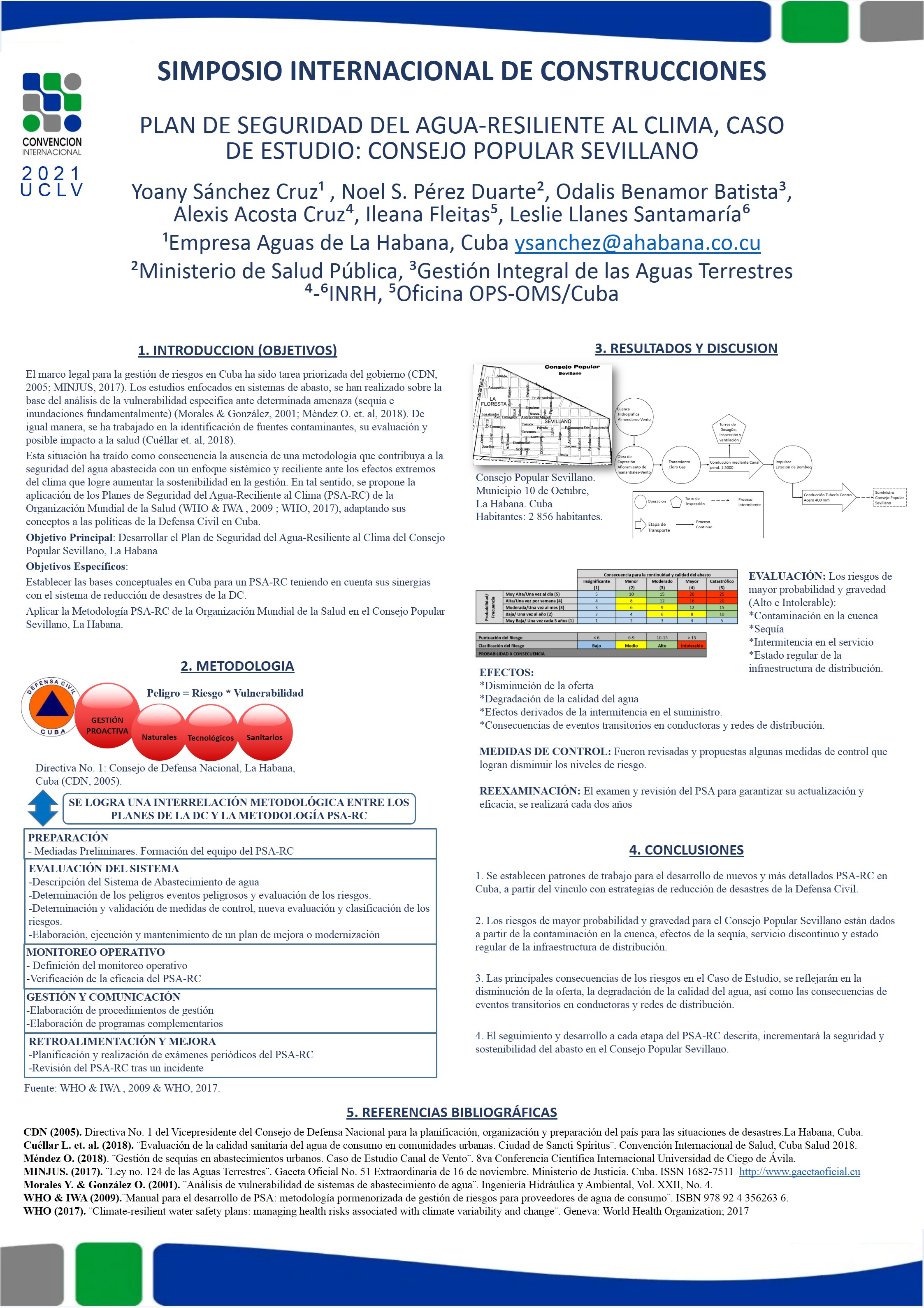 En este trabajo se presenta, el Plan de Seguridad del Agua-Resiliente al Clima (PSA-RC) para el abasto de agua potable al Consejo Popular Sevillano, en La Habana. La zona de estudio fue analizada teniendo en cuenta la integralidad en la gestión a través de sus diferentes etapas: cuenca hidrográfica, obra de captación, tratamiento, conducción, distribución y consumo. De igual manera, la incidencia de eventos climáticos extremos, es analizada como factor agravante de riesgos.