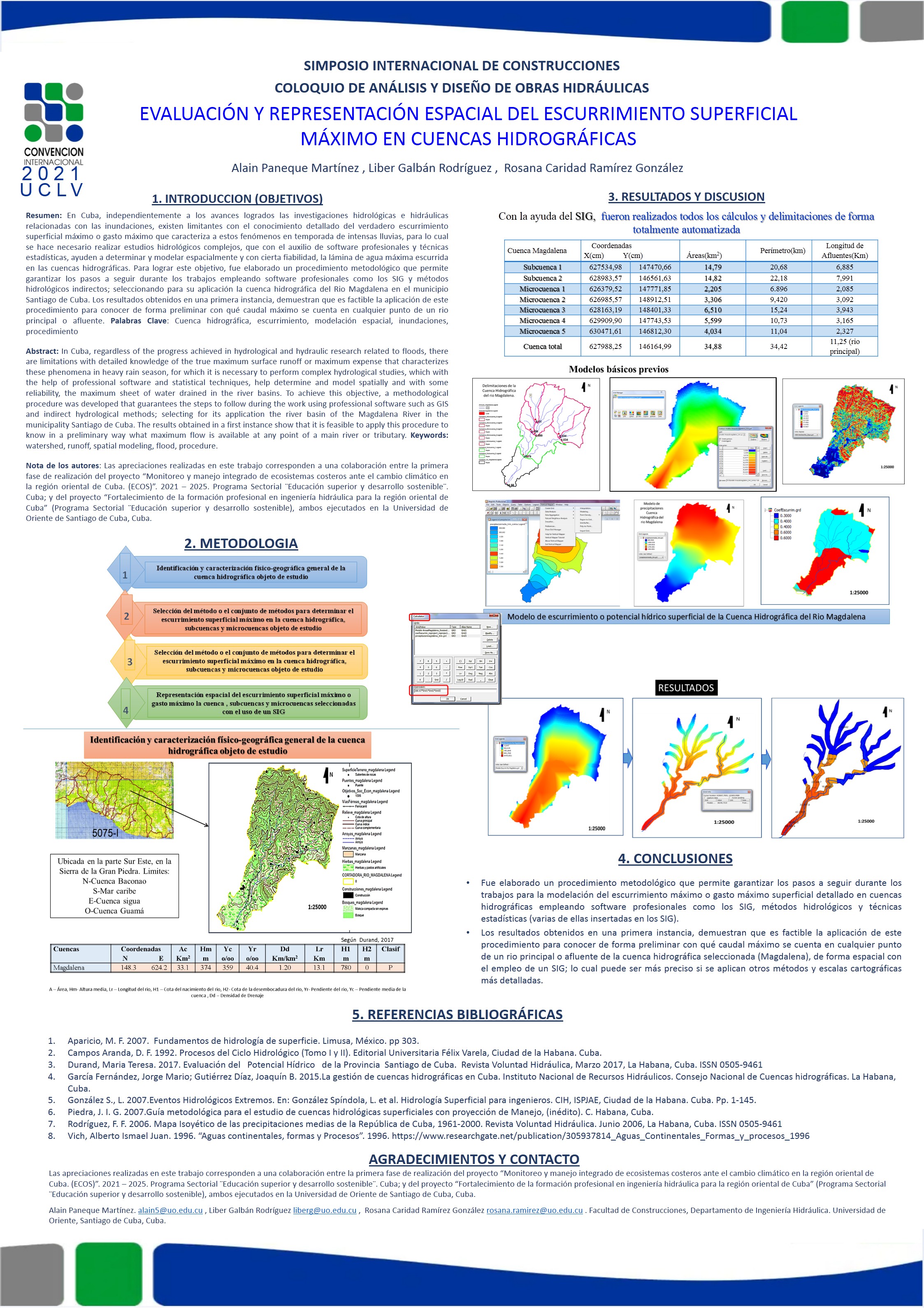 En Cuba, independientemente a los avances logrados las investigaciones hidrológicas e hidráulicas relacionadas con las inundaciones, existen limitantes con el conocimiento detallado del verdadero escurrimiento superficial máximo o gasto máximo que caracteriza a estos fenómenos en temporada de intensas lluvias, para lo cual se hace necesario realizar estudios hidrológicos complejos, que con el auxilio de software profesionales y técnicas estadísticas, ayuden a determinar y modelar espacialmente y con cierta fiabilidad, la lámina de agua máxima escurrida en las cuencas hidrográficas. Para lograr este objetivo, fue elaborado un procedimiento metodológico que permite garantizar los pasos a seguir durante los trabajos empleando software profesionales como los SIG y métodos hidrológicos indirectos; seleccionando para su aplicación la cuenca hidrográfica del Rio Magdalena en el municipio Santiago de Cuba. Los resultados obtenidos en una primera instancia, demuestran que es factible la aplicación de este procedimiento para conocer de forma preliminar con qué caudal máximo se cuenta en cualquier punto de un rio principal o afluente